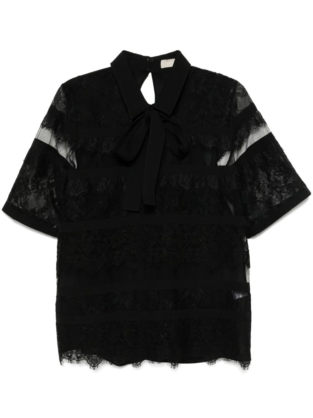 lace blouse Highlights - Black - Rear hook and eye fastening - Self-tie fastening - Lace trim Imported Composition Outer: Nylon 48%, Polyamide 23%, Organic Cotton 23%, Silk 6% Lining: Silk 100%