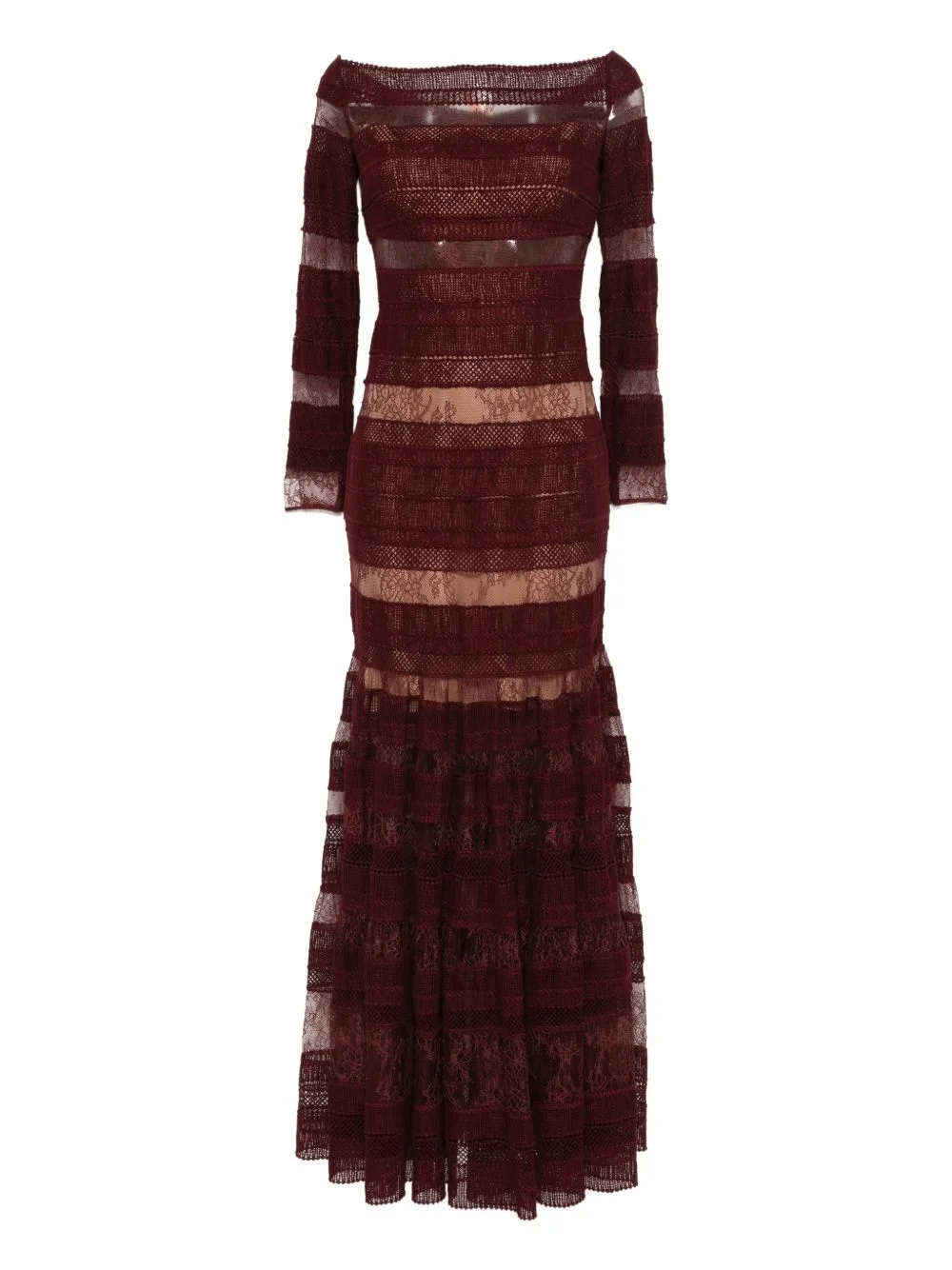 lace long-sleeved dress Highlights - Burgundy - Lace detail - Long sleeves - Off-shoulder - Tiered skirt - Zip fastening Imported Composition Outer: Nylon 40%, Cotton 34%, Silk 20%, Polyester 6% SIZE & FIT Model measurements Height 5 ft 10 in(1.78 m) Bust/Chest 33.46 in(85 cm) Hips 36.22 in(92 cm) Waist 23.22 in(59 cm) Washing instructions Read Manufacturer Guidelines