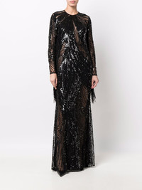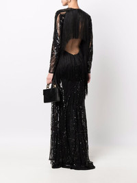 long bead-embellished gown black silk blend bead embellishment fringe detailing open back concealed rear zip fastening round neck long sleeves Imported Composition Outer: Silk 62%, Acetate 26%, Polyamide 12% Lining: Silk 100% SIZE & FIT Model measurements Height 5 ft 10 in(1.78 m) Bust/Chest 33.07 in(84 cm) Hips 35.82 in(91 cm) Waist 25.98 in(66 cm) FittingInformation This piece fits true to size. We recommend you get your regular size Designed for a close fit at the bust, waist and hips Made with a mid-weight fabric Washing instructions Dry Clean Only