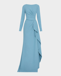 - Elie Saab cady gown featuring a draped waist and a side ruffle slit - High neckline - Long sleeves; invisible zip cuffs - A-line silhouette - Floor length - Invisible back zip - Silk/viscose - Made in Lebanon
