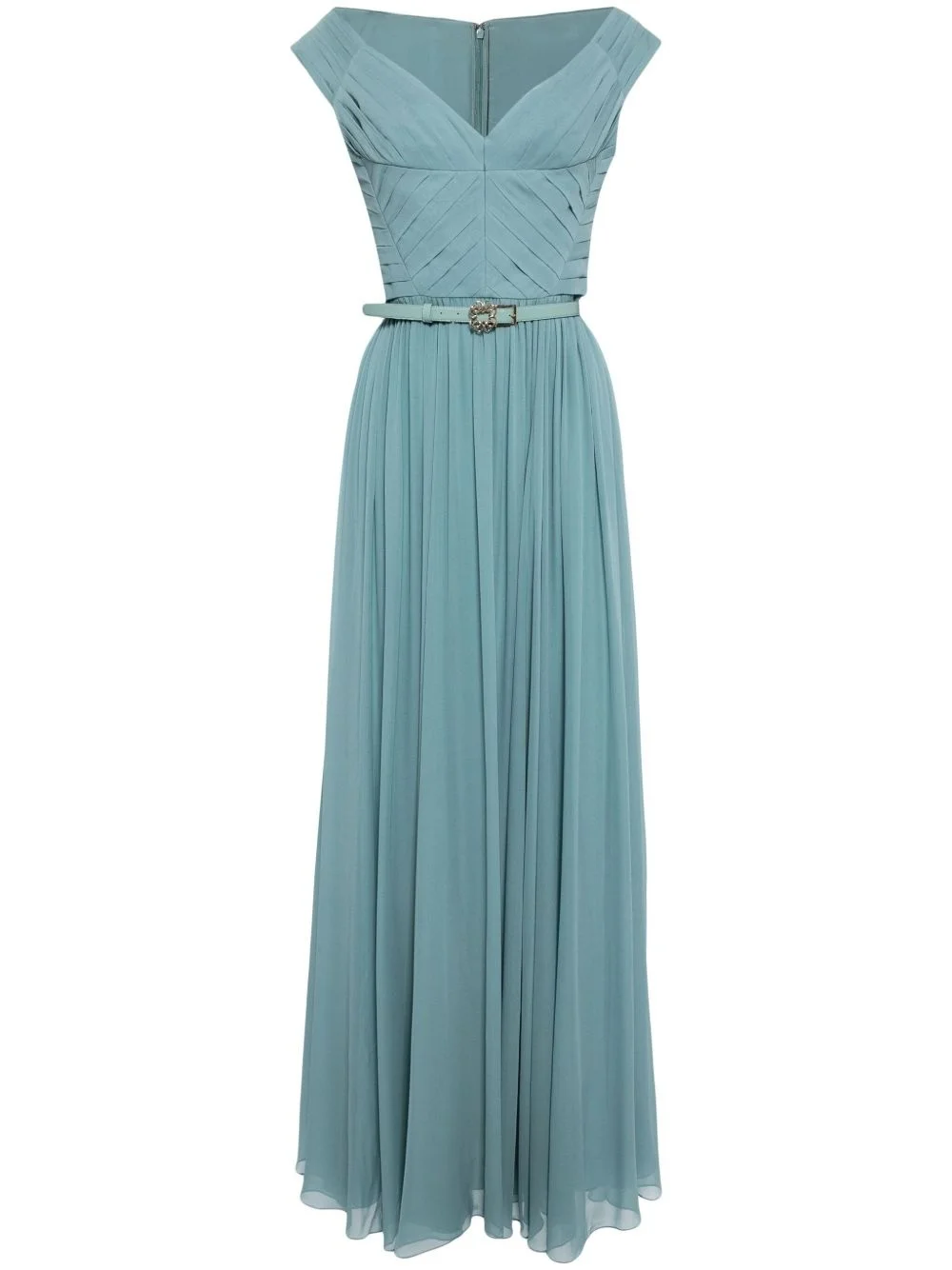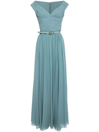 off-the-shoulder silk dress Highlights - Cerulean blue - Silk - V-neck - Off-shoulder - Pleated bodice - Detachable belt with monogram buckle - Detachable scarf - Concealed rear zip fastening - Flared design - Silk lining - Floor-length Imported Composition Outer: Silk 100% Lining: Silk 100% SIZE & FIT Model measurements Height 5 ft 10 in(1.77 m) Bust/Chest 30.7 in(78 cm) Hips 35.03 in(89 cm) Waist 23.62 in(60 cm) FittingInformation Designed for a close fit at the chest and waist with a loose fit at the hip The belt offers adjustability for fitted preferences Made from a midweight non-stretch fabric This piece fits true to size – take your usual size