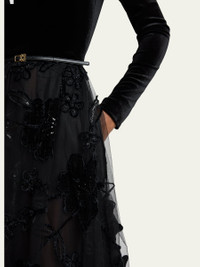 Elie Saab gown with velvet bodice and a tulle skirt embellished in floral velvet sequin embroidery Off-the-shoulder neckline Long sleeves Fit-and-flare silhouette Floor sweeping hem Bakc zip Polyester/silk/spandex Dry clean Made in Lebanon Online Inquiries: BGS21_BA5MW| Store Inquiries: #5040378