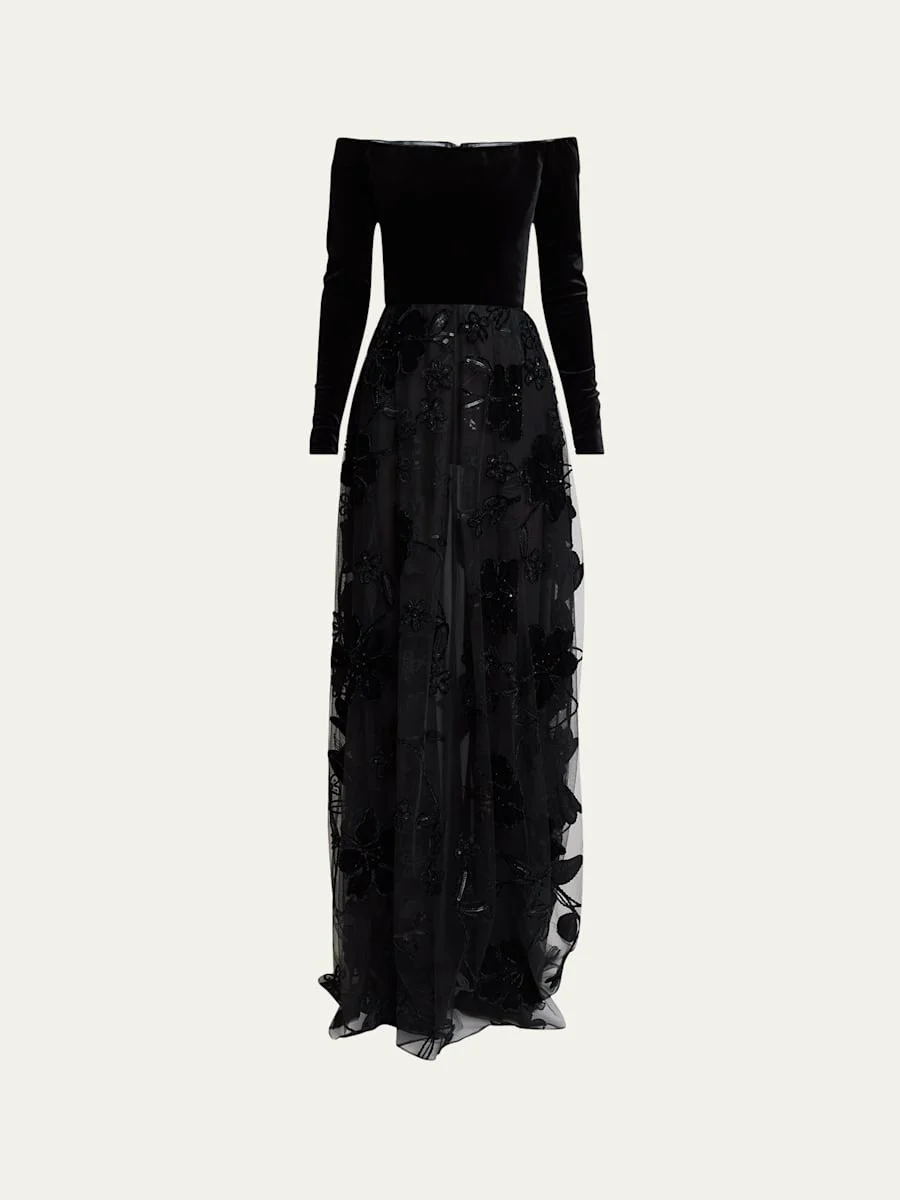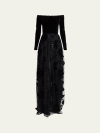 Off-The-Shoulder Velvet Sequined Tulle Gown
