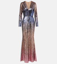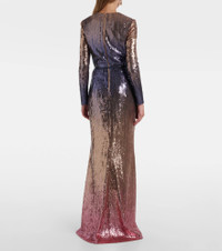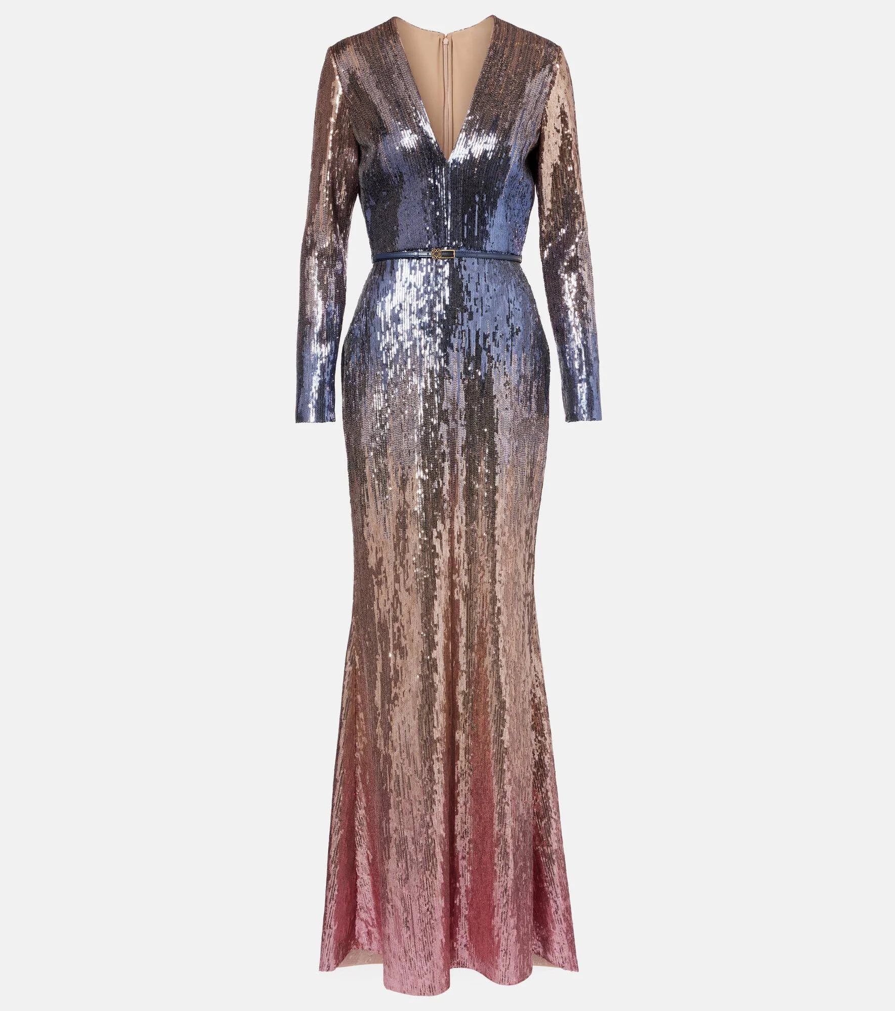 Elie Saab’s impactful designs are proof that the right outfit can make a special occasion all the more memorable. This belted gown is cut to a flattering floor-length silhouette and decorated with all-over sequins to create a dazzling ombre effect. Product Details - Material: 42% nylon, 36% silk, 22% polyamide - Care instructions: dry clean - Made in Lebanon - Designer color name: Blush Rose/Cerulean Glacier - Item color: pink, gold, blue - Lining: 100% silk - Collar: V-neck - Cuff: zipped - Detachable belt - Closure: zipped back, hook-fastening back - Item number: P01090502 Size & Fit - Fits large to size - we recommend trying one size smaller - Fitted - Non-stretchy fabric - The model seen in the picture is 178cm-5'10" and wearing a size FR 36