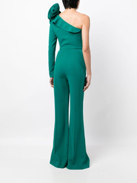 one-shoulder ruffled jumpsuit Highlights - Green - Ruffled detailing - One-shoulder - Single long sleeve - Side zip fastening - Flared hem Imported Composition Outer: Viscose 50%, Acetate 47%, Elastane 3% SIZE & FIT Model measurements Height 5 ft 10 in(1.77 m) Bust/Chest 31.49 in(80 cm) Hips 35.43 in(90 cm) Waist 25.19 in(64 cm) Measurement INSIDE LEG 35.43 in(90 cm) HIPS 38.58 in(98 cm)