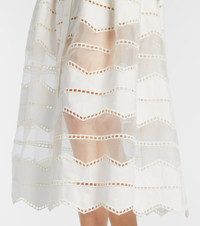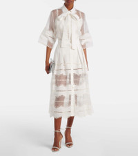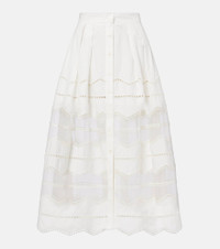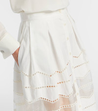 Elie Saab’s impactful designs are proof that the right outfit can make a special occasion all the more memorable. This cotton midi skirt is a flared style with sheer organza panels and a buttoned front. Product Details - Material: 89% cotton, 8% silk, 3% polyester - Care instructions: dry clean - Made in Lebanon - Color: white - Designer color name: Powder White - Item color: white - Lining: 100% cotton - Closure: buttoned front - Pockets: side slit pockets - Item number: P01127461 Size & Fit - True to size - Non-stretchy fabric - The model seen in the picture is 178cm-5'10" and wearing a size FR 36