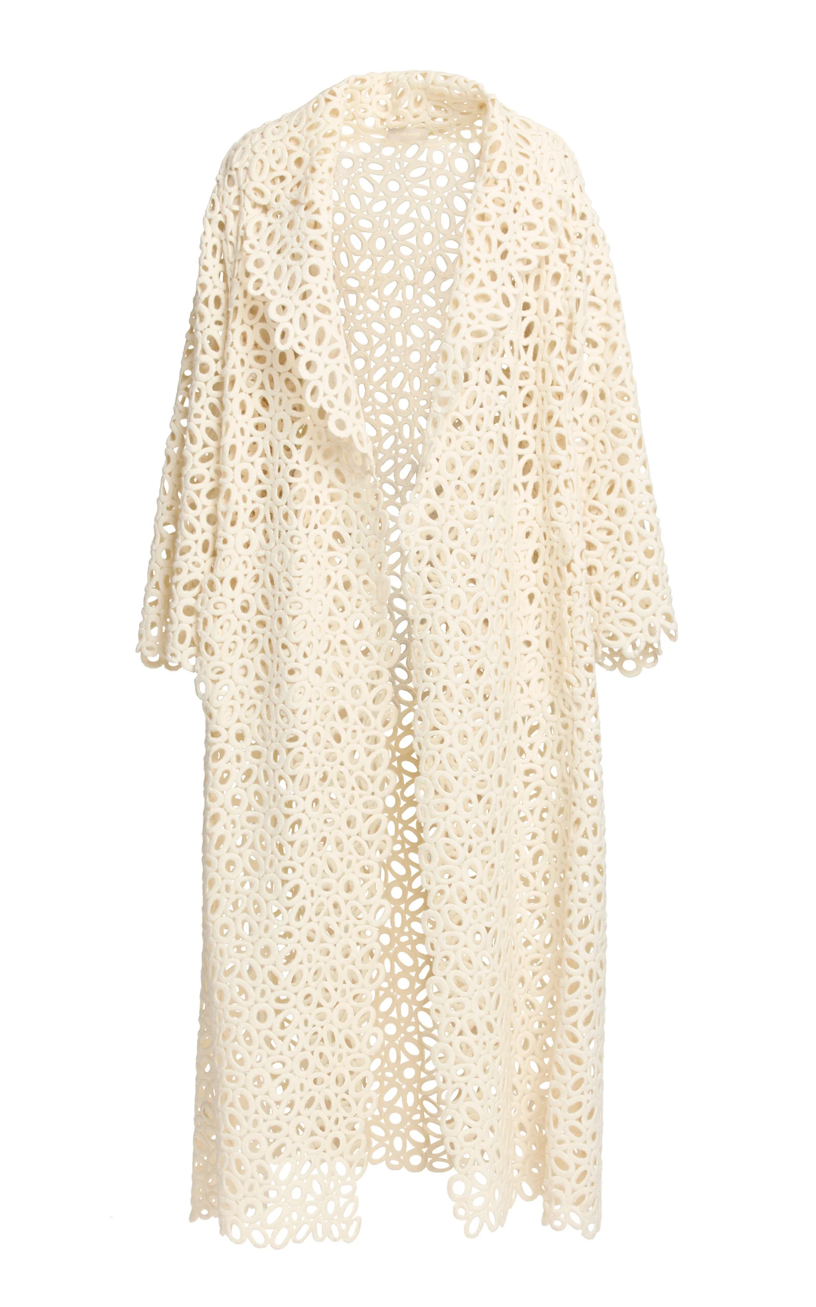 PRODUCT DETAILS - Oversized fit, long sleeves, lapel - Slips on - Composition: Macrame - Color: POWDER WHITE - Dry Clean Only - Fall '25