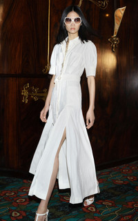 PRODUCT DETAILS - Short puff sleeve, shirting silhouette, slit details, midi hem - Button fastening through front - Composition: Pinstripe Crepe - Color: Powder White - Dry clean only - Pre-Fall '25