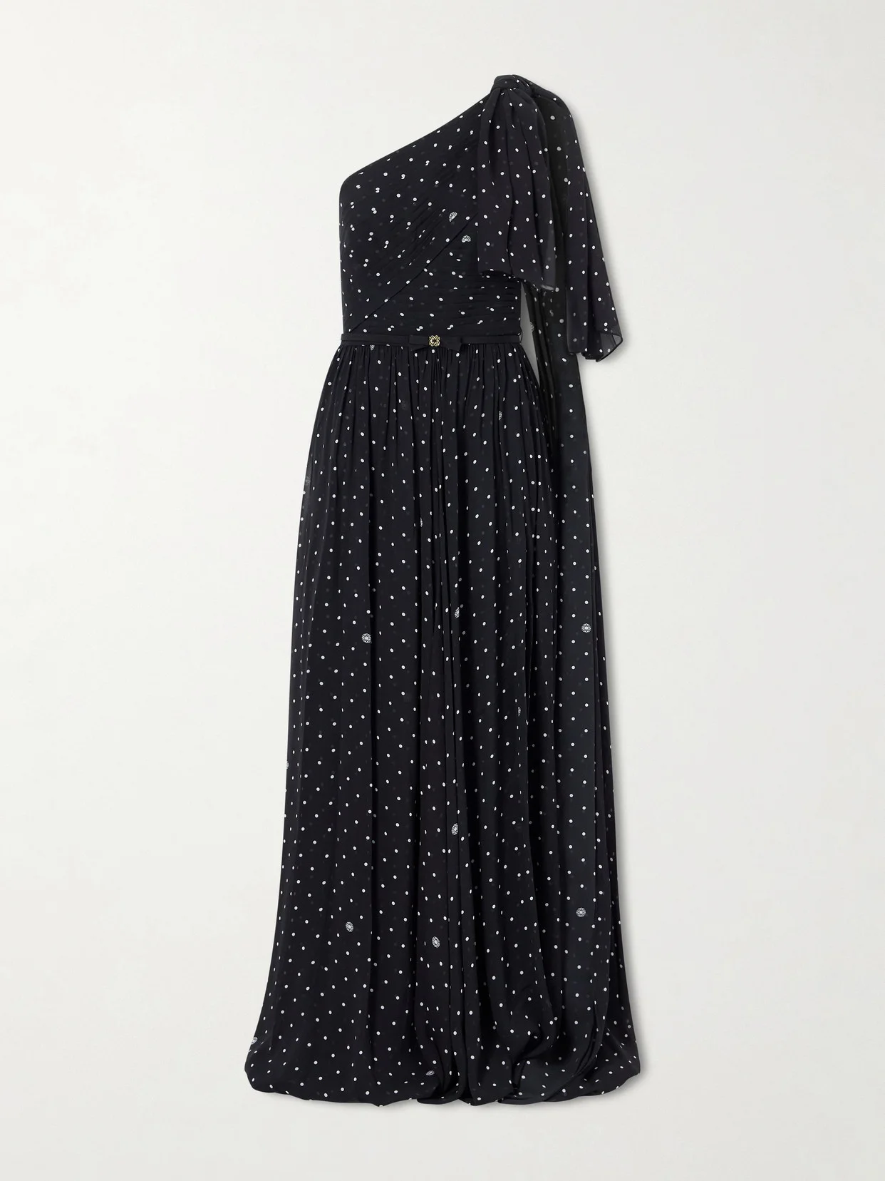 Elie Saab's chiffon gown is adorned with a polka-dot print all-over in a subtle nod to 50's styles. The one-shoulder neckline and thigh-high skirt split gives it a showstopping shape. Heighten the glamour with your favorite heels.