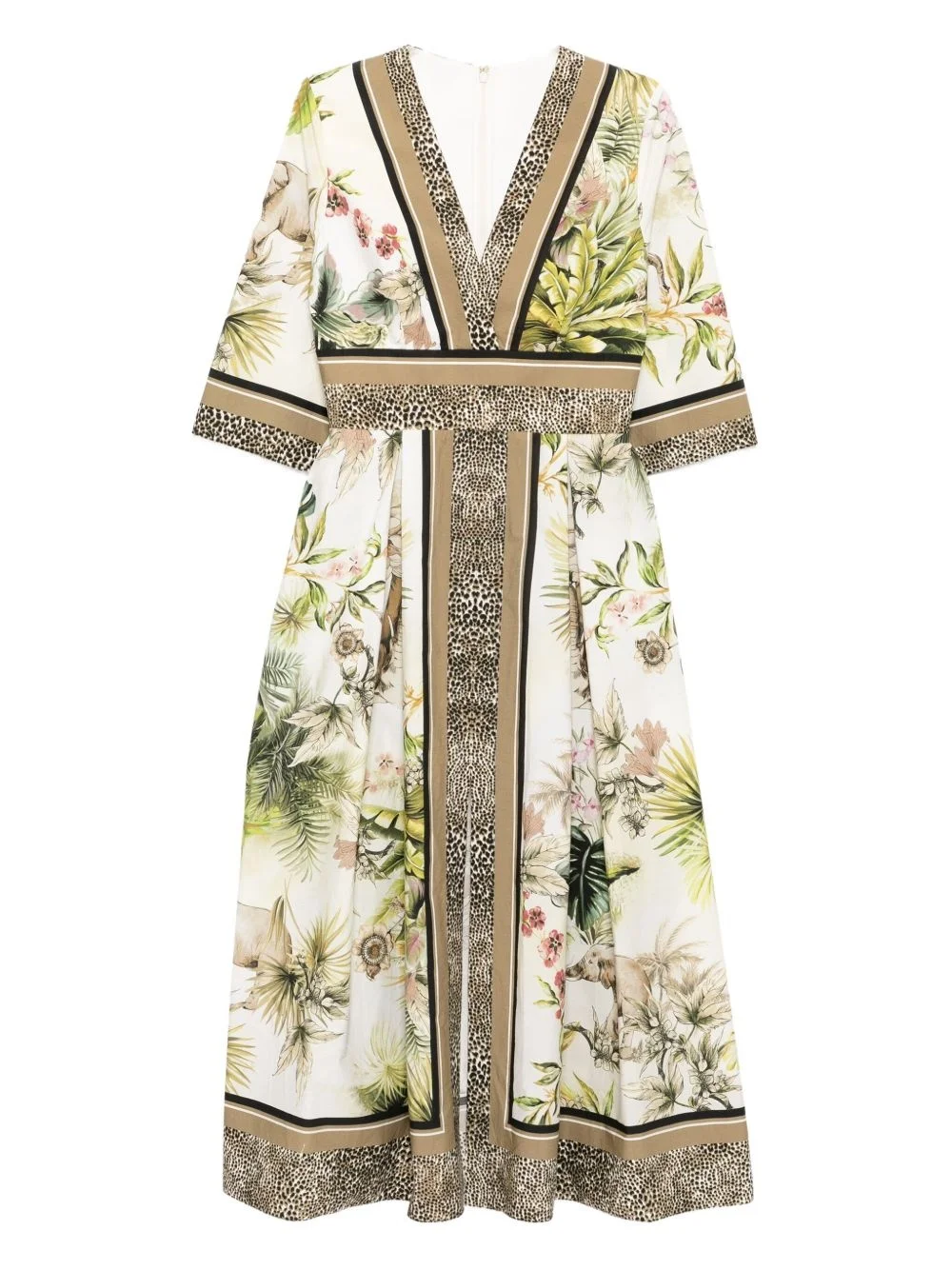 savannah-print dress Highlights - Green - Concealed rear hook and zip fastening - V-neck - Short sleeves - Two side inset pockets Imported Composition Silk 64%, Organic Cotton 36% SIZE & FIT Model measurements Height 5 ft 10 in(1.78 m) Bust/Chest 29.92 in(76 cm) Hips 34.64 in(88 cm) Waist 24.8 in(63 cm) FittingInformation Designed for a close fit at the chest with a loose fit over the waist and hips Made from a midweight non-stretch fabric Washing instructions Dry Clean Only