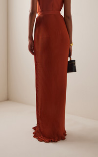 PRODUCT DETAILS - High-waisted, plisse, ruffled trim, midi hem - Concealed zip fastening - Composition: Chiffon Poly - Color: Marchesa Orange - Dry clean only - Pre-Fall '25