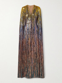 Inspired by the "timeless mystique of the Orient Express"; Elie Saab's Pre-Fall '25 collection combines the opulence of the Belle Epoque era with '70s silhouettes. This stunning gown is cut from tulle and covered with sequins in shades of yellow, periwinkle and blush. It has split, floor-grazing sleeves that create a sweeping cape-effect when you walk and is designed for a slim fit.