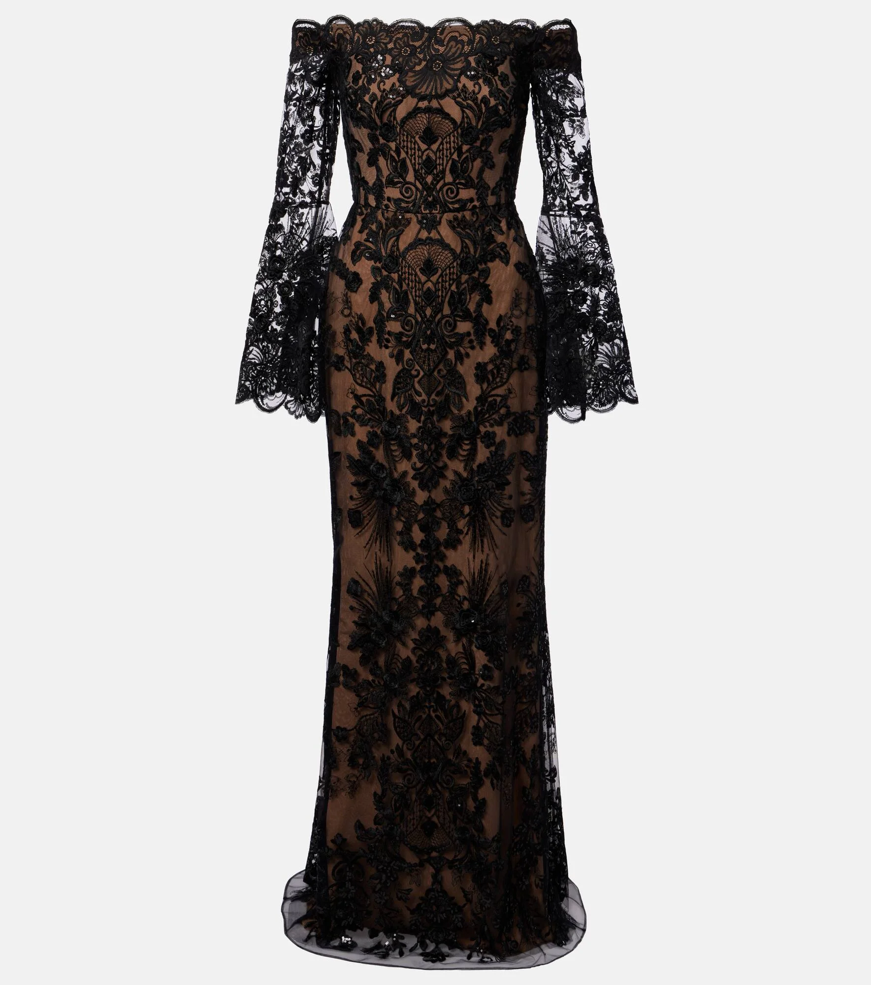 Elie Saab’s impactful designs are proof that the right outfit can make a special occasion all the more memorable. Carefully crafted from delicate lace, this gown showcases an off-shoulder neckline, a floor-sweeping skirt, and shimmering sequin embellishments for an eye-catching effect. Product Details - Material: 43% silk, 29% rayon, 28% nylon - Care instructions: dry clean - Made in Lebanon - Color: black - Designer color name: Black - Lining: 100% silk - Boning - Closure: concealed zipped back - Item number: P01127529 Size & Fit - True to size - Off-the-shoulder - Internal boned corset for support - Cinched waist - Non-stretchy fabric - The model seen in the picture is 178cm-5'10" and wearing a size FR 36