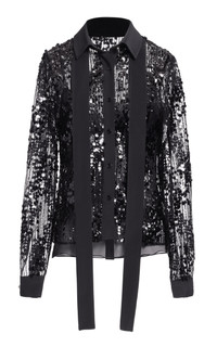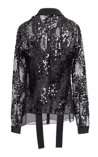 PRODUCT DETAILS - Sequin embellished, tie neck, sheer - Button fastening through front - Lined - Composition: Paillettes - Color: Black - Dry clean only - Pre-Fall '25