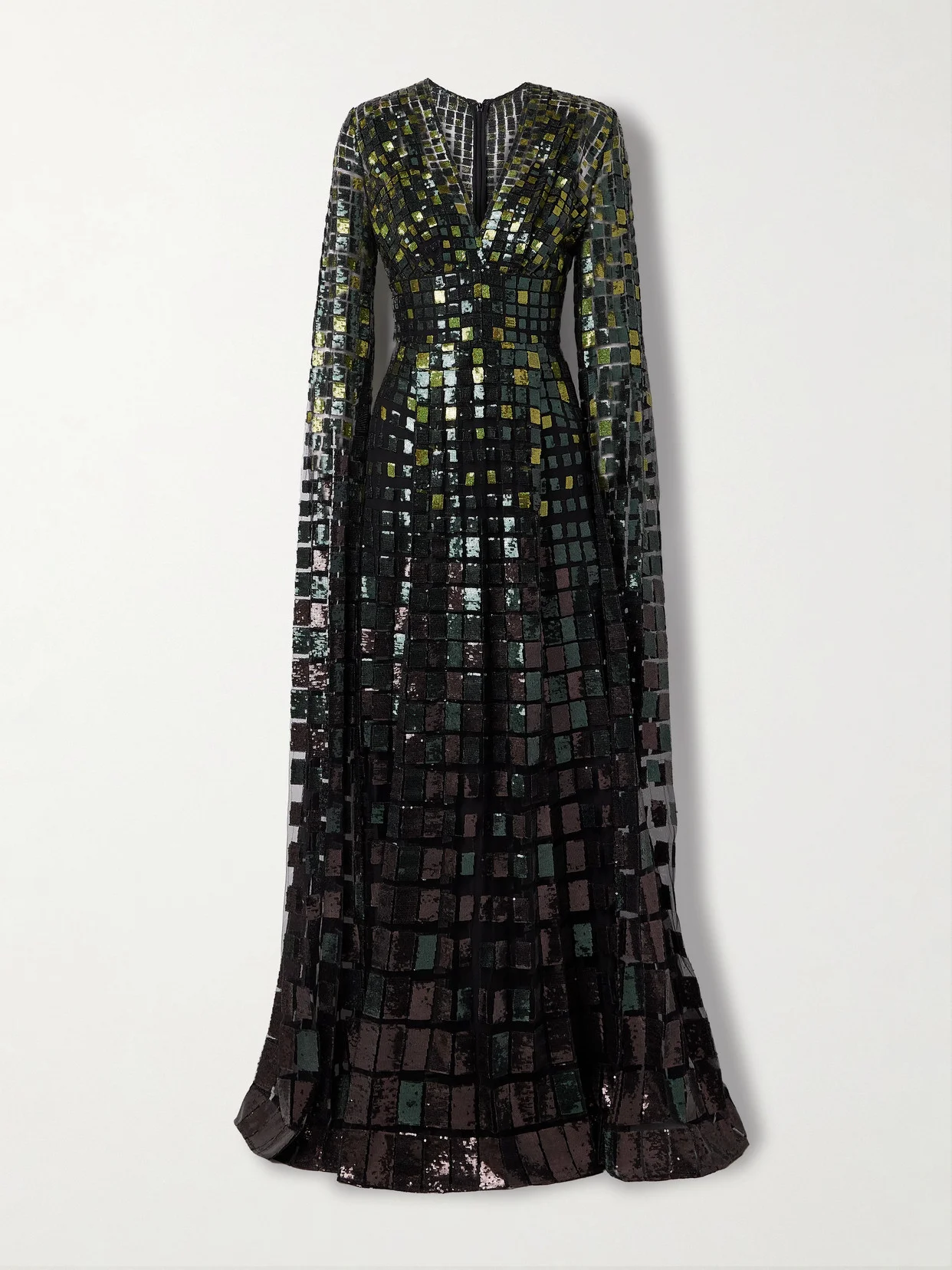 Elie Saab's gown is adorned with squares of sequins grouped together to create a cool, pixelated effect. Cut from lightweight tulle, it has dramatic, floor-grazing sleeves and is lined to the thighs, revealing a hint of skin through the skirt.