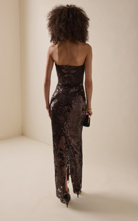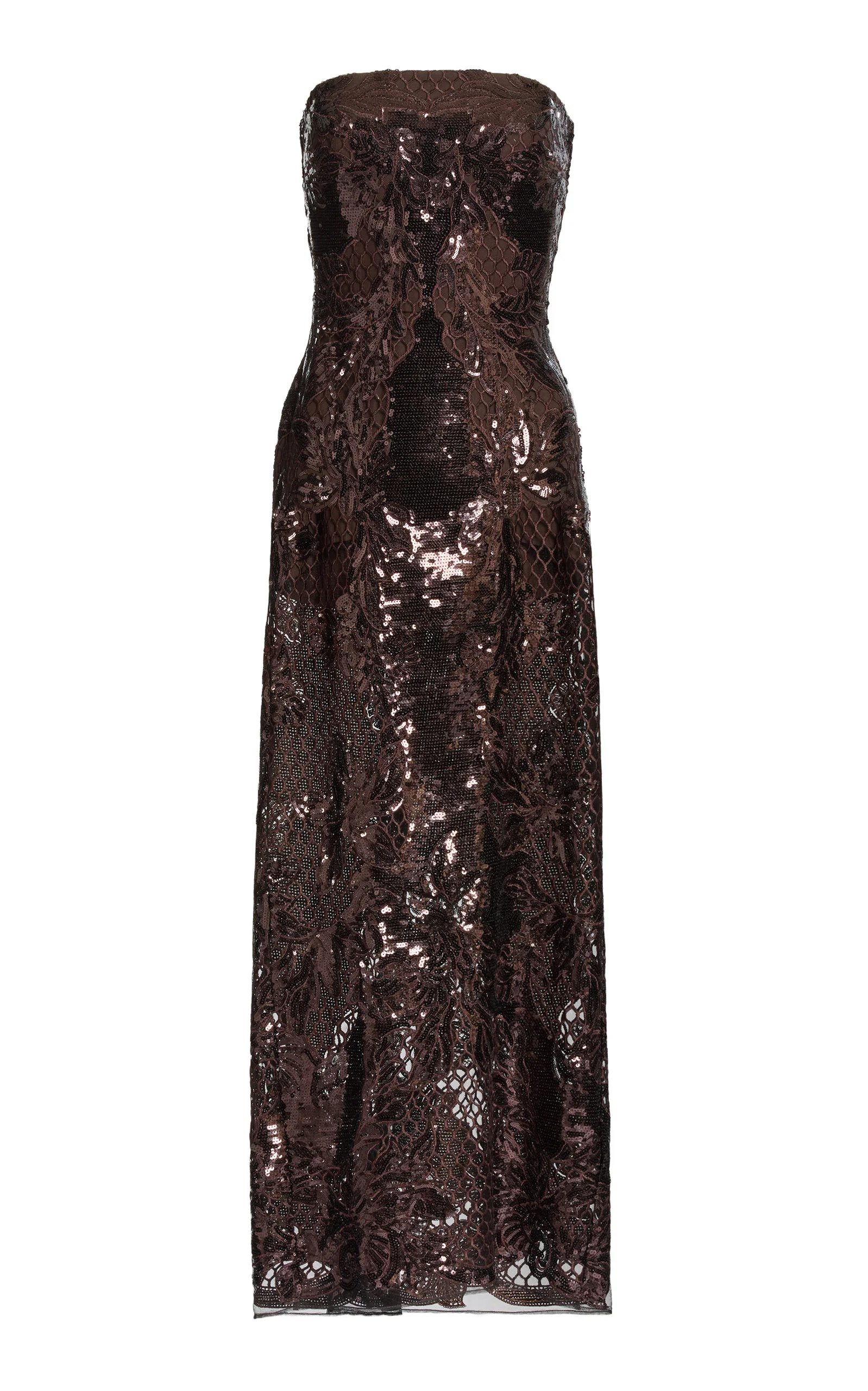 PRODUCT DETAILS - Slim fit, strapless, sequins - Zipper fastening - Lined - Composition: Embroidered Tulle - Color: CHOCOLATE BROWN - Dry Clean Only - Fall '25