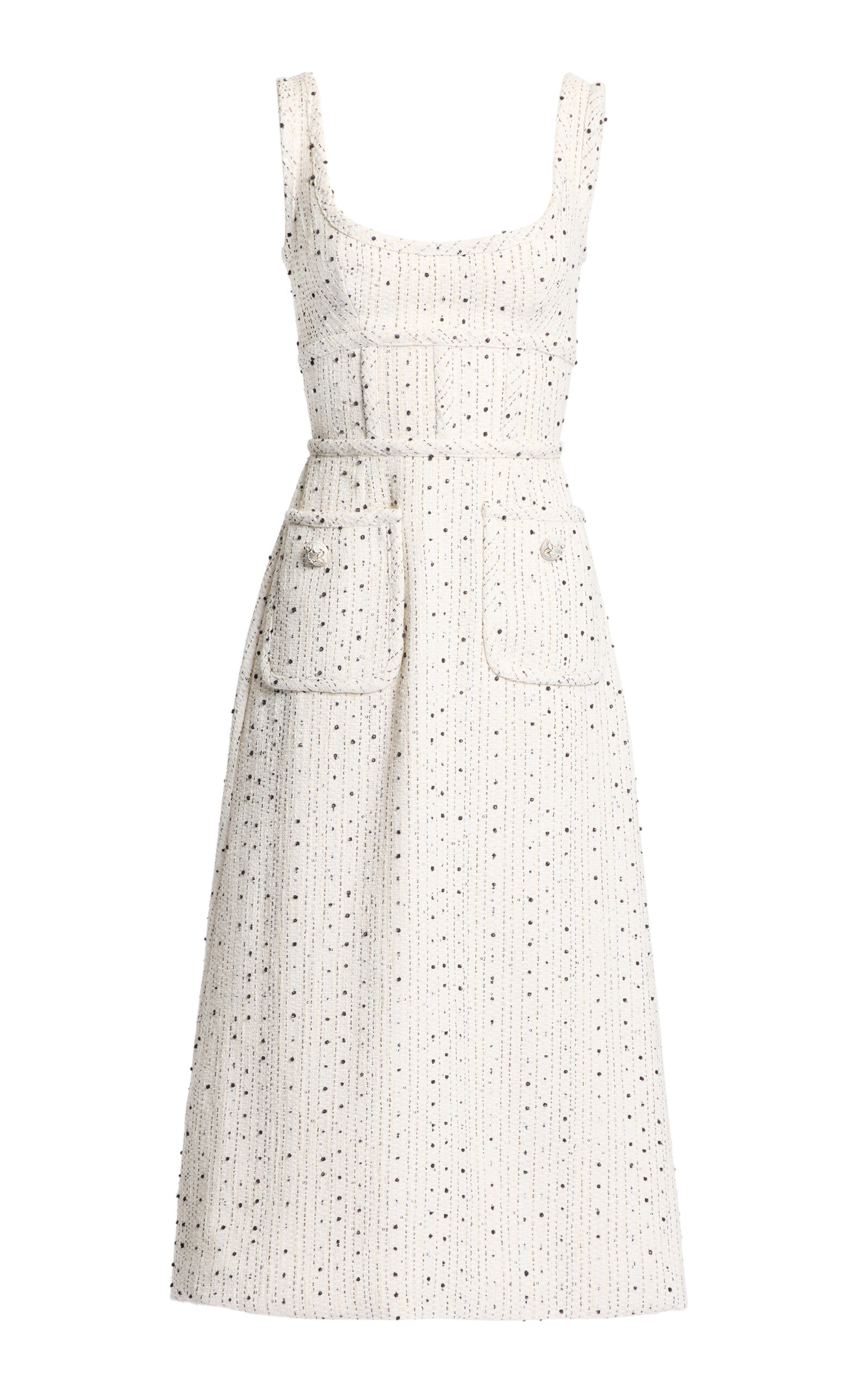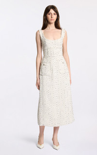 PRODUCT DETAILS - Resort '25 - Sleeveless, sequin embroidered, square neck, A-line, patch pockets, midi hem - Lined - Composition: Tweed, Paillette Sequins - Color: black/white - Concealed zip fastening along back - Made in Lebanon