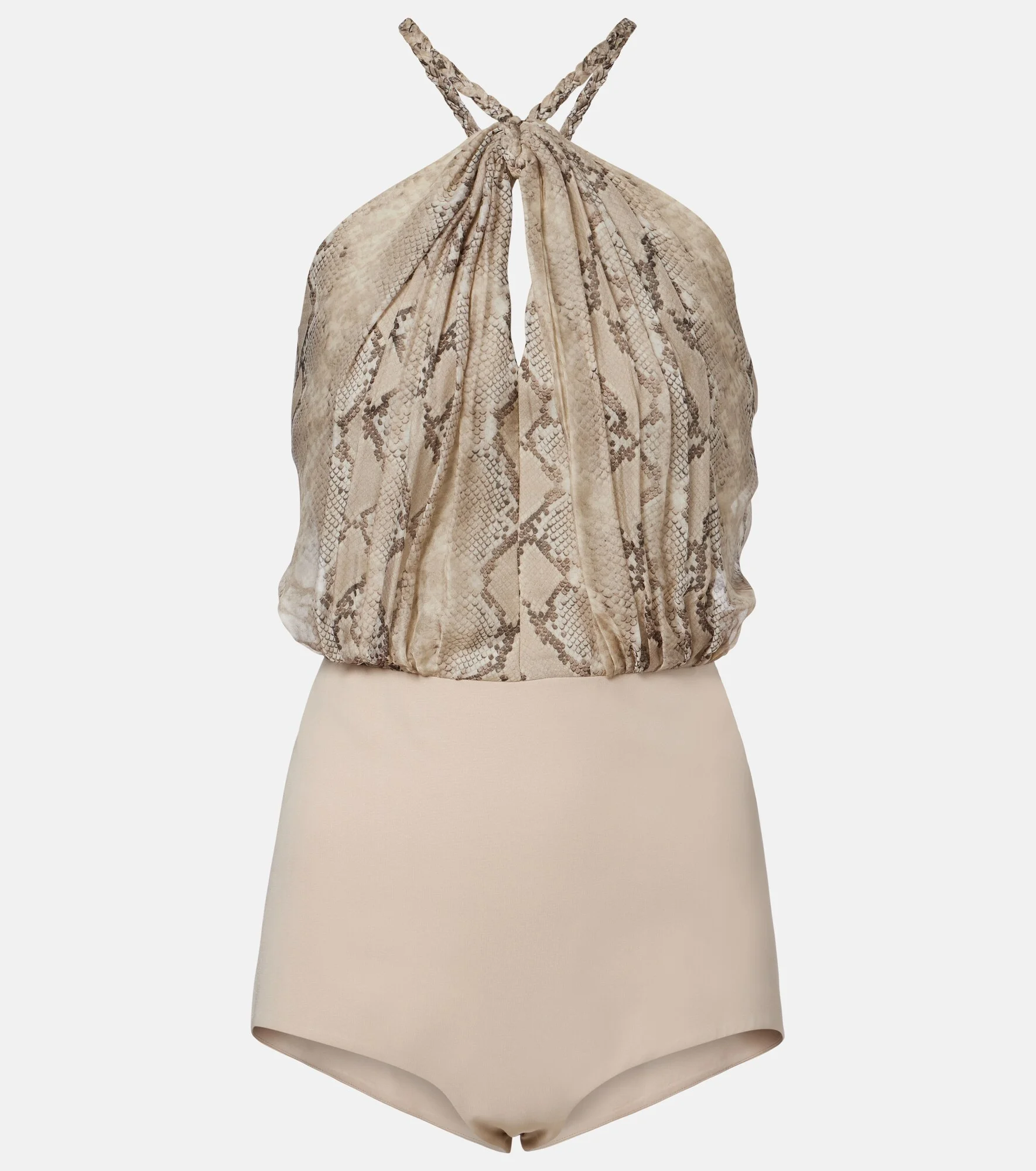 This lightweight silk chiffon bodysuit from Elie Saab is cut to a halterneck silhouette and detailed with an all-over snake print. The piece is designed with a draped bodice and crossed back straps. Product Details - Material: 100% silk - Care instructions: dry clean - Made in Lebanon - Color: beige - Designer color name: Phyton Print - Lining: 100% silk - Closure: snap-buttoned fastenings - Item number: P01158228 Size & Fit - True to size - Cinched waist - Partly stretchy fabric - Low-cut leg - The model seen in the picture is 178cm-5'10" and wearing a size FR 36