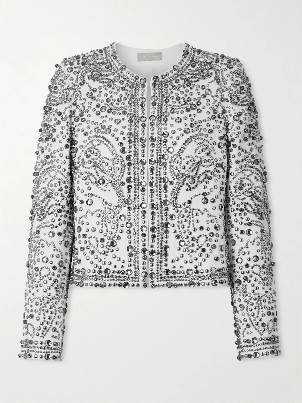The ornate stud and crystals mapping Elie Saab's jacket are a love letter to the swirling grandeur of interiors seen in Paris and Beirut. It's expertly tailored from cady that promises to hold the straight, subtly cropped shape and is hand-finished at the label's atelier. Wear yours with tonal tailoring.