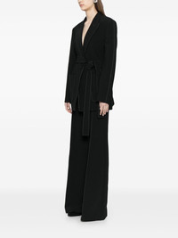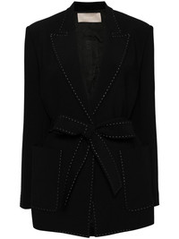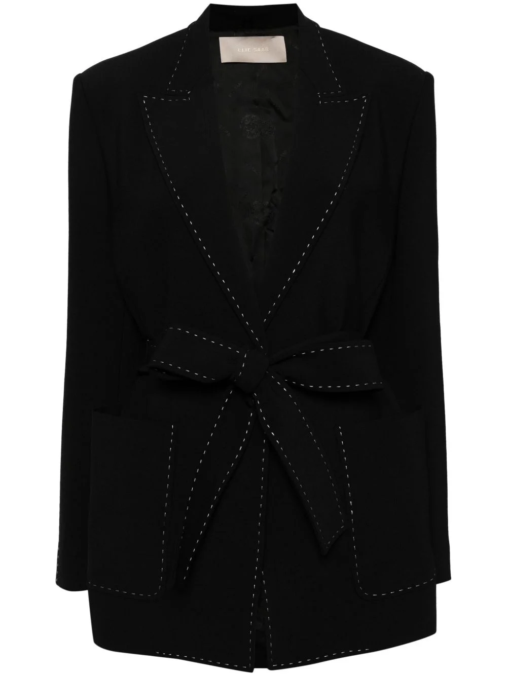 topstitch blazer Highlights - Black - Virgin wool blend - Contrast stitching - Peak lapels - Front button fastening - Long sleeves - Belted waist - Two front patch pockets - Straight hem Made in Italy Composition Outer: Polyester 52%, Virgin Wool 43%, Elastane 5% Lining: Viscose 100% SIZE & FIT Model measurements Height 5 ft 10 in(1.77 m) Bust/Chest 30.7 in(78 cm) Hips 35.03 in(89 cm) Waist 23.62 in(60 cm) FittingInformation Designed to be unstructured, offering a loose fit throughout The internal shoulder pads offer a structured shape Made from a lightweight stretch fabric, this piece offers elasticity and flexibility when worn This piece fits true to size – take your usual size