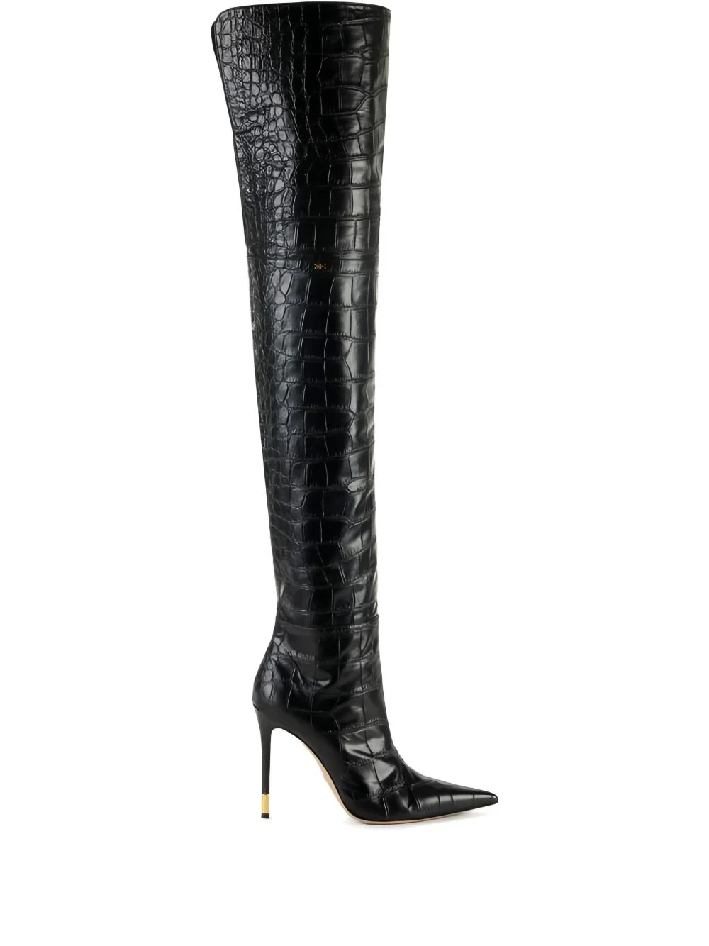 105mm crocodile-print over-the-knee boots Highlights - Black - Crocodile print - Stiletto heel - Pointed toe - Gold-tone heel detail - Over-the-knee style Imported Composition Outer: Polyurethane 53%, Polyester 47% Lining: Polyurethane 53%, Polyester 47% Sole: Leather 100% SIZE & FIT Measurement HEEL 4.13 in(10.5 cm)