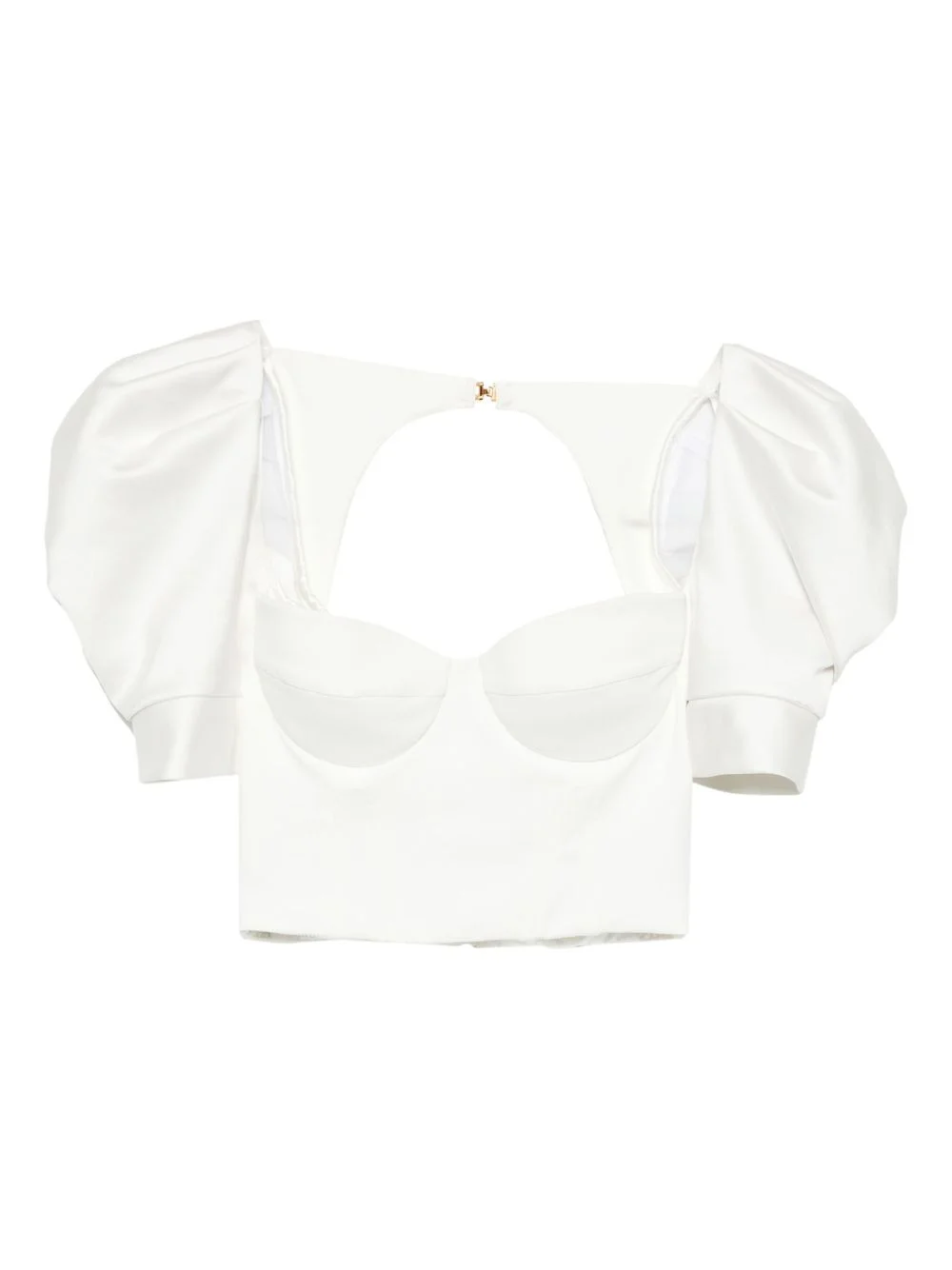 crepe satin top Highlights - White - Rear zip fastening - Buckle-collar fastening Made in Italy Composition Polyester 95%, Elastane 5% Washing instructions Dry Clean Only