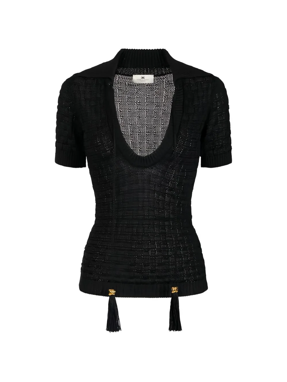 basket-stitch tassel knit top Highlights - Black - Basket stitch knitting - Tassels - Metal clasps - Short sleeves Made in Italy Composition Linen/Flax 80%, Viscose 20% Washing instructions Read Manufacturer Guidelines