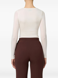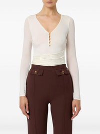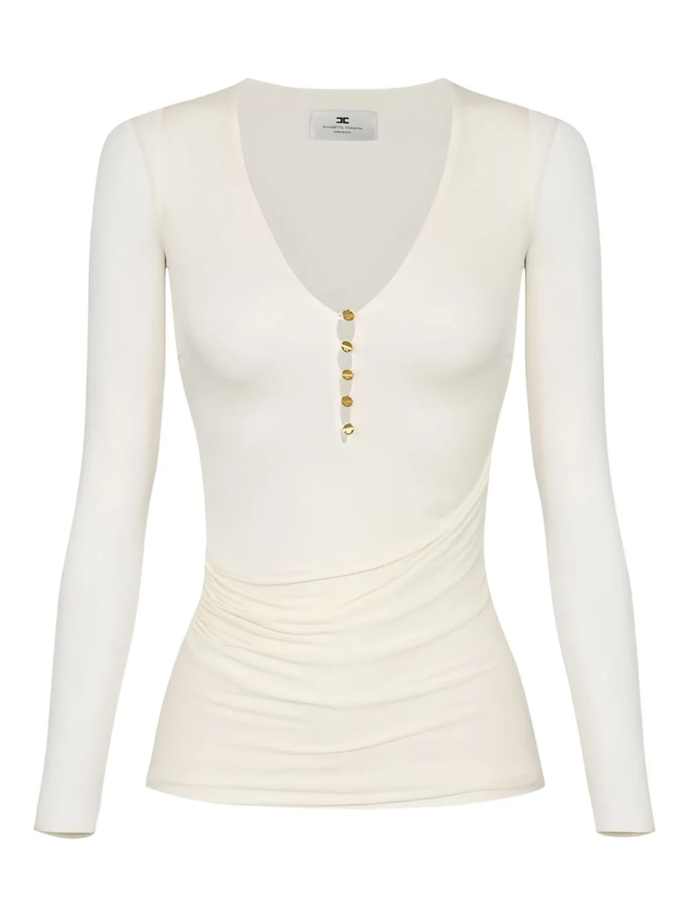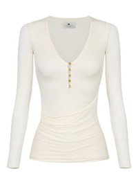 button-detail draped top Highlights - Milk - Ribbed knit - V-neck - Long sleeves - Logo buttons - Draped waist - Buttons in gold-tone metal with logo Made in Italy Composition Silk 89%, Spandex/Elastane 11% Washing instructions Read Manufacturer Guidelines
