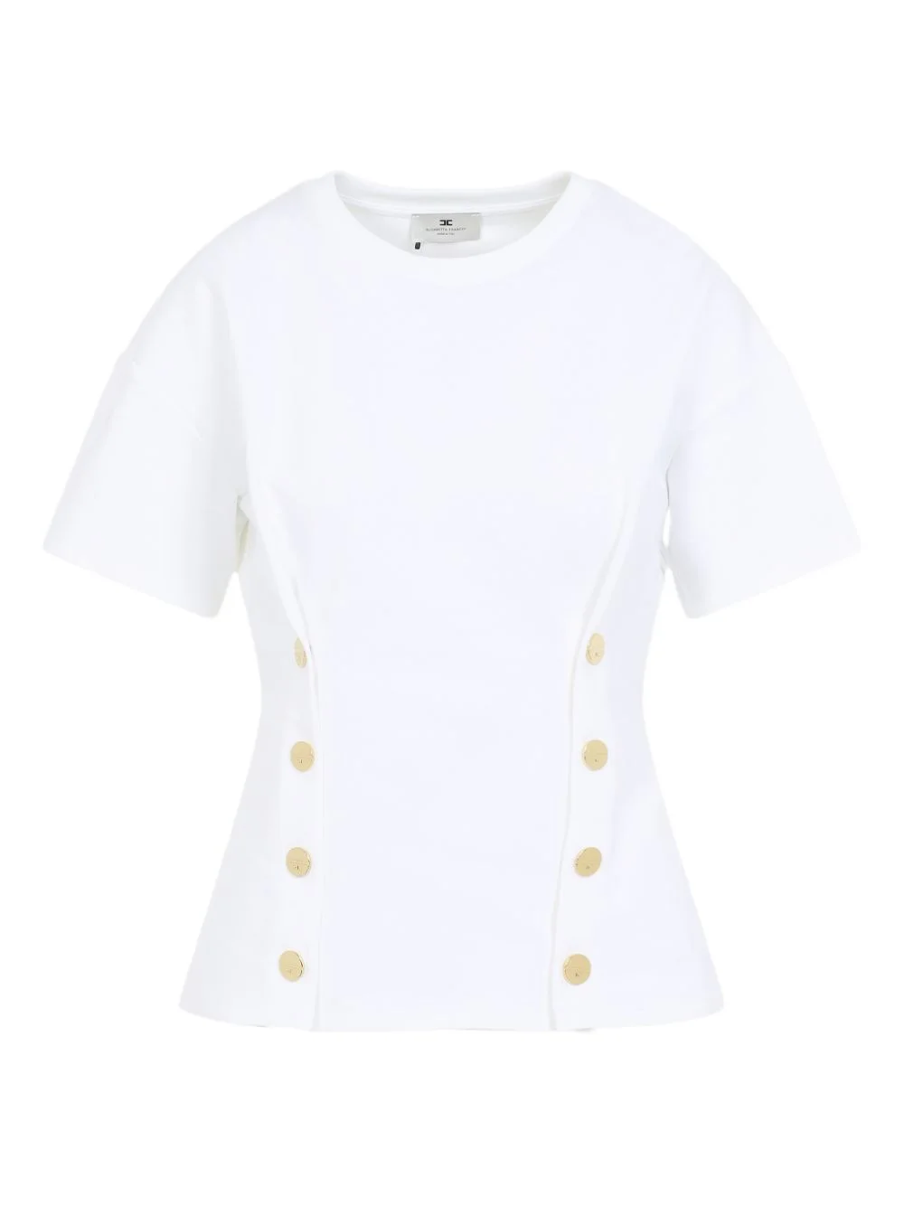 button-detail top Highlights - White - Round neck - Short sleeves - Button embellishment Made in Italy Composition Cotton 87%, Polyamide 8%, Elastane 5% Washing instructions Read Manufacturer Guidelines