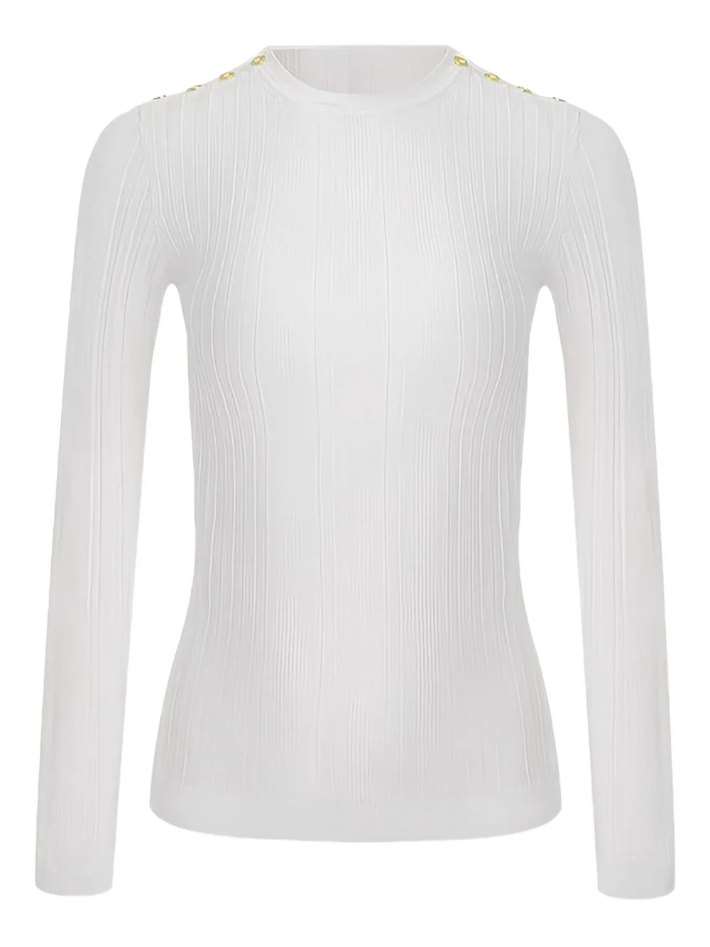 buttoned-shoulder ribbed T-shirt Highlights - White - Ribbed knit - Button embellishments - Crew neck - Long sleeve Imported Composition Viscose 71%, Polyester 29% Washing instructions Read Manufacturer Guidelines