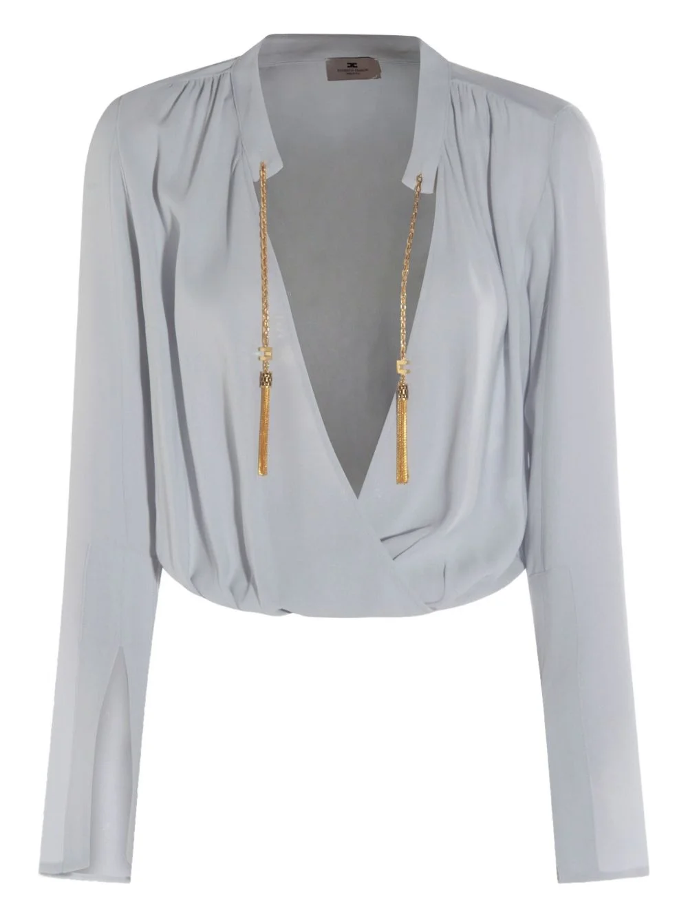 chain-tassel detail blouse Highlights - Light grey - V-neckline - Gold-tone chain detail - Tassel embellishments - Long sleeves Made in Italy Composition Polyester 95%, Elastane 5% Washing instructions Read Manufacturer Guidelines