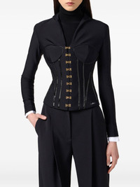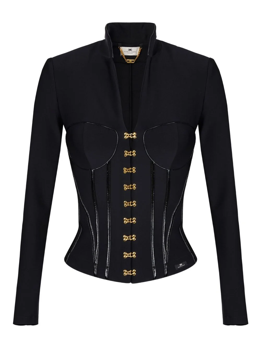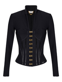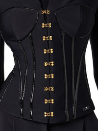 corset-detailed jacket Highlights - Black - Corset detailing - Gold-tone button embellishment - Patent trims - Long sleeves Made in Italy Composition Polyamide 72%, Elastane 28% Washing instructions Read Manufacturer Guidelines