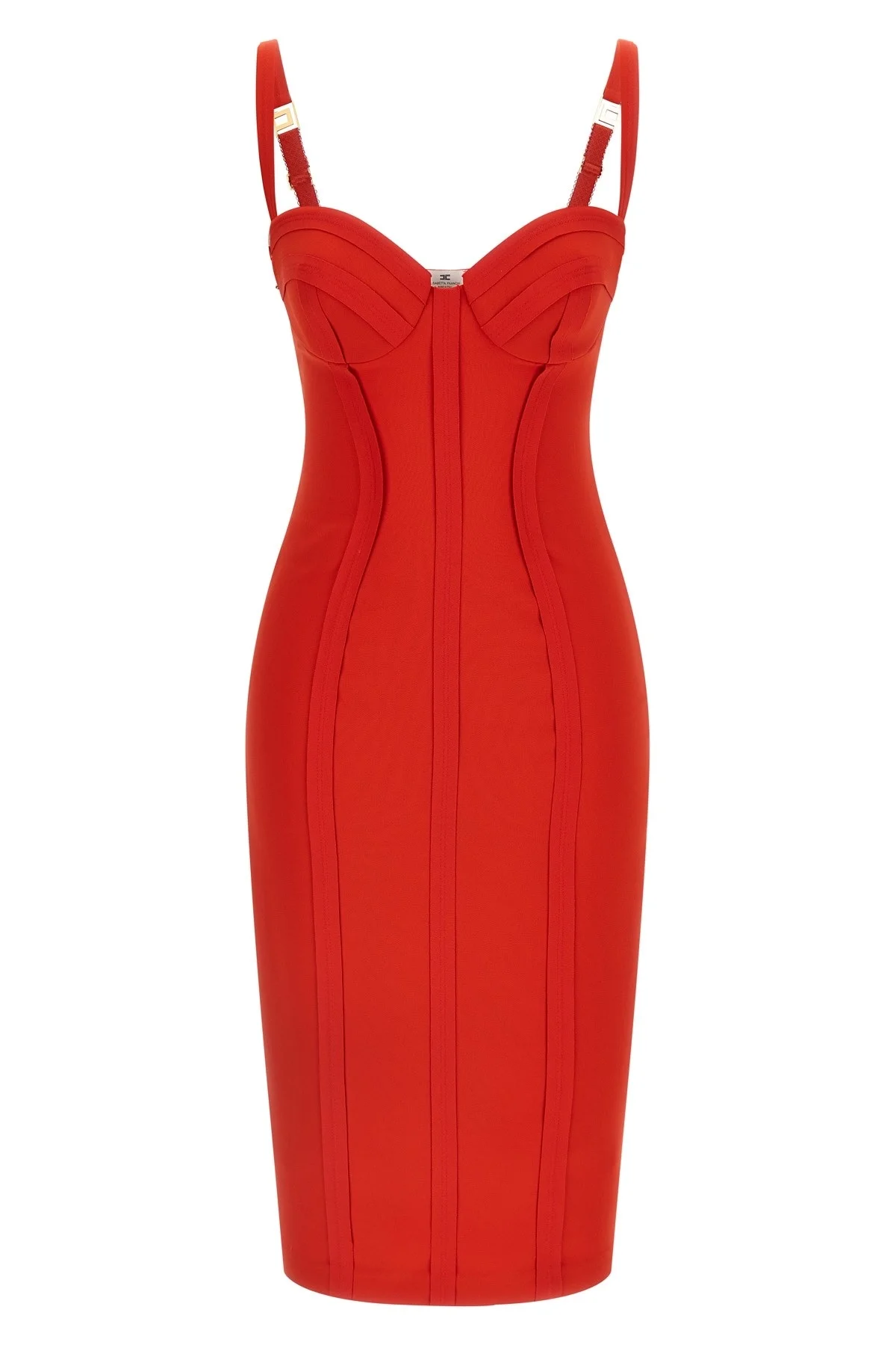 cod. AB91861E2H85 Light crepe midi dress, bustier construction with pre-shaped cups, inner bra with back hook closure, sweetheart neckline, thin adjustable straps with metal logo detail, back split, side zip closure. Color: Orange Size & Fit: Slim fit Composition: 95% polyester, 5% elastane Made in: Italy