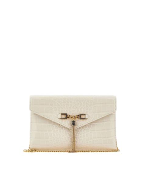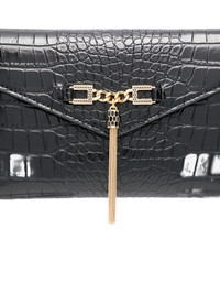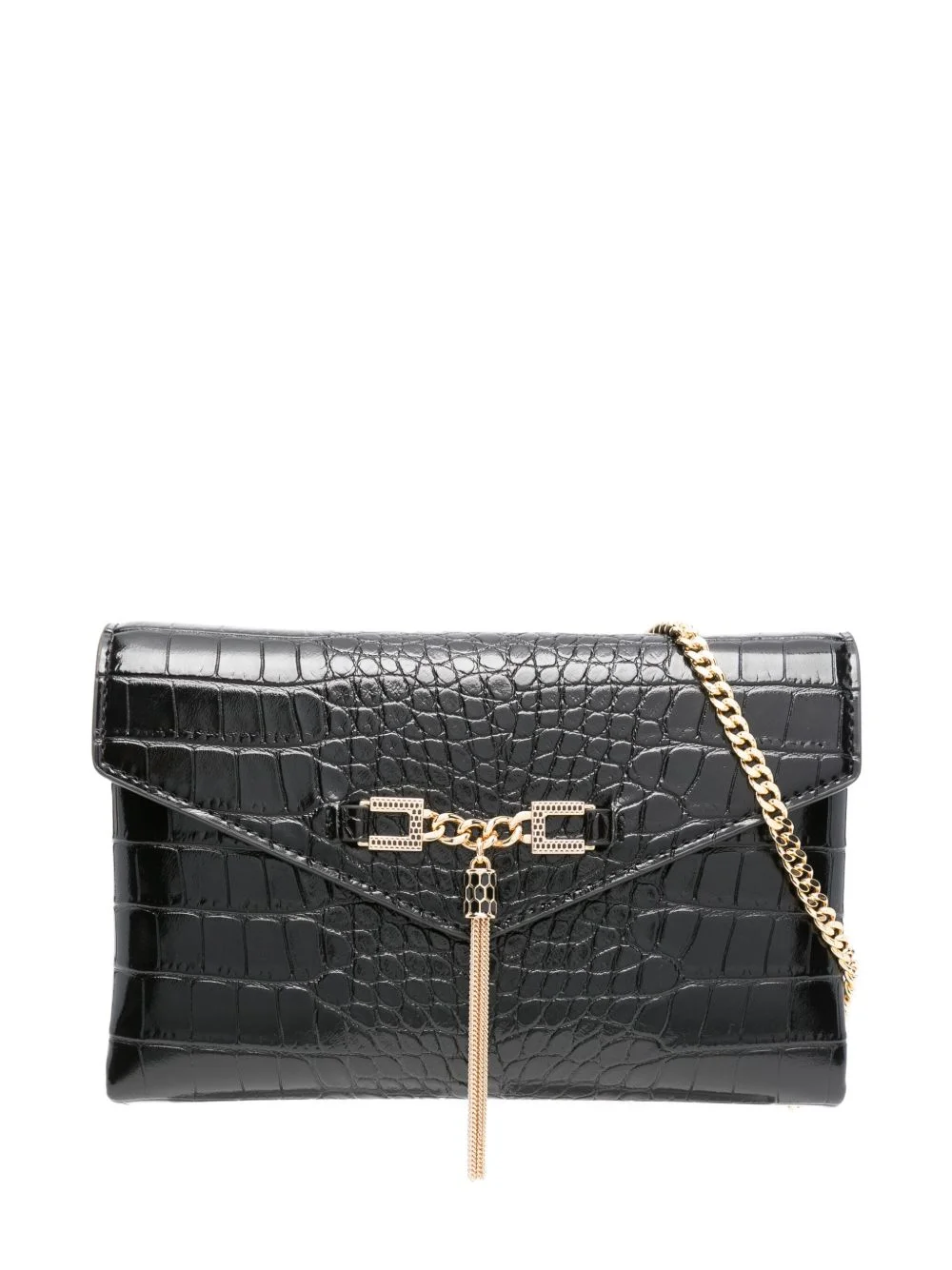 crocodile-effect chain clutch Highlights - Black - Crocodile-effect texture - Gold-tone chain embellishment - Clasp fastening Made in Italy Composition Lining: Polyester 100% Outer: Polyurethane 60%, Polyester 40% SIZE & FIT Measurement DEPTH 1.18 in(3 cm) HEIGHT 5.9 in(15 cm) WIDTH 8.66 in(22 cm)