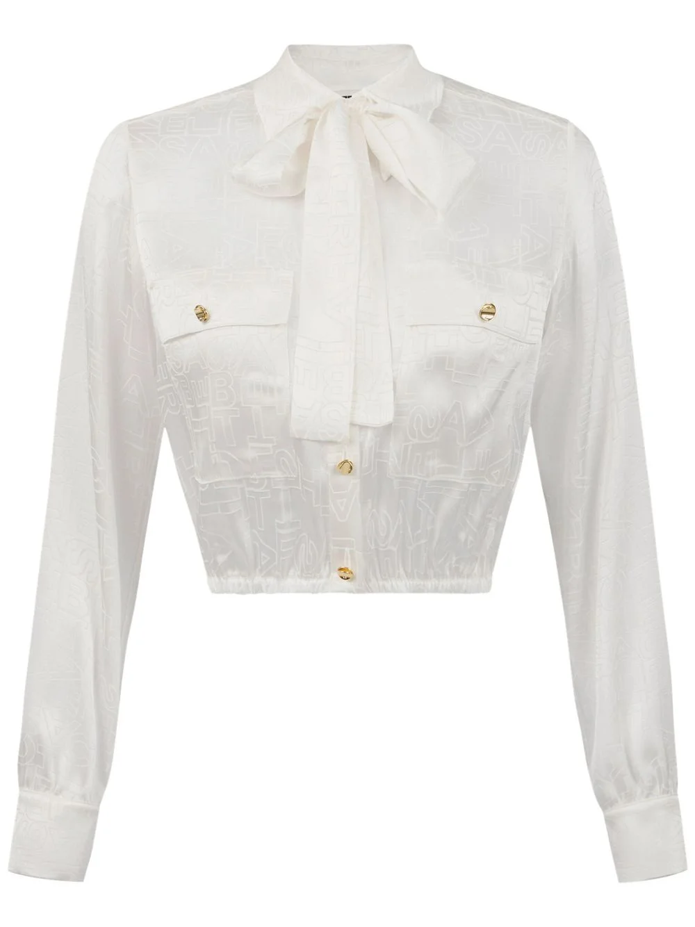 cropped jacquard blouse Highlights - White - Silk satin - Patterned jacquard - Front button fastening - Gold-tone buttons - Classic collar - Bow detailing - Two button-fastening chest pockets - Long sleeves - Elasticated hem - Cropped Made in Italy Composition Acetate 75%, Silk 25% Washing instructions Read Manufacturer Guidelines