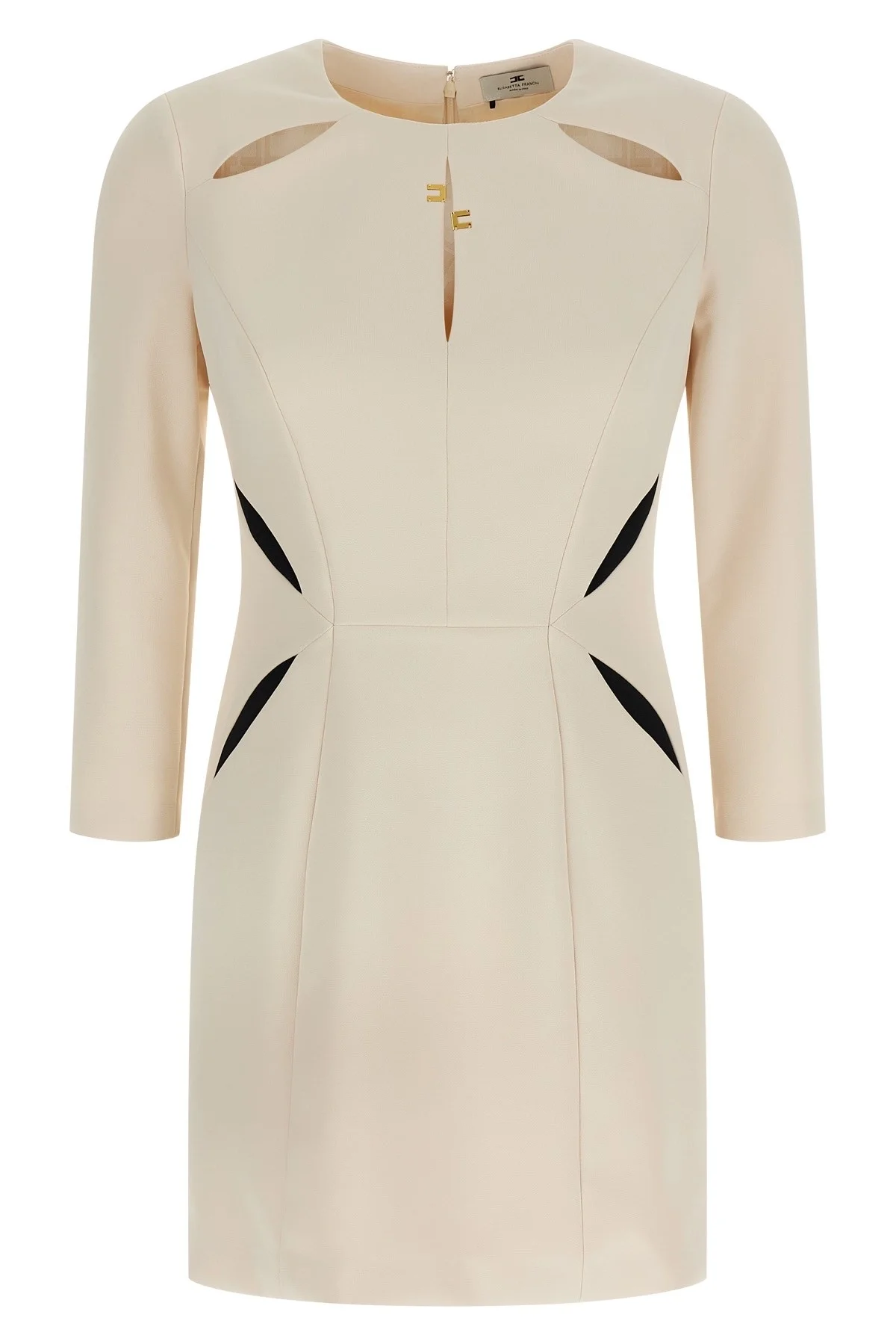 cod. AB86861E2E84 Lightweight crepe mini dress, construction with cut-out details with and without contrast patch, asymmetrical metal logo on the front, crew neck, 3/4 sleeves, back zip closure, monogram satin lining. Color: White/Black Size & Fit: true to size fit Composition: 95% polyester, 5% elastane Made in: Italy