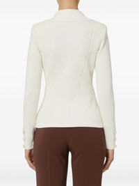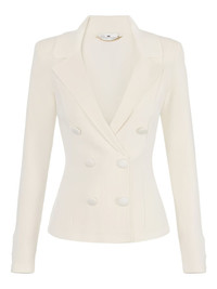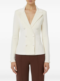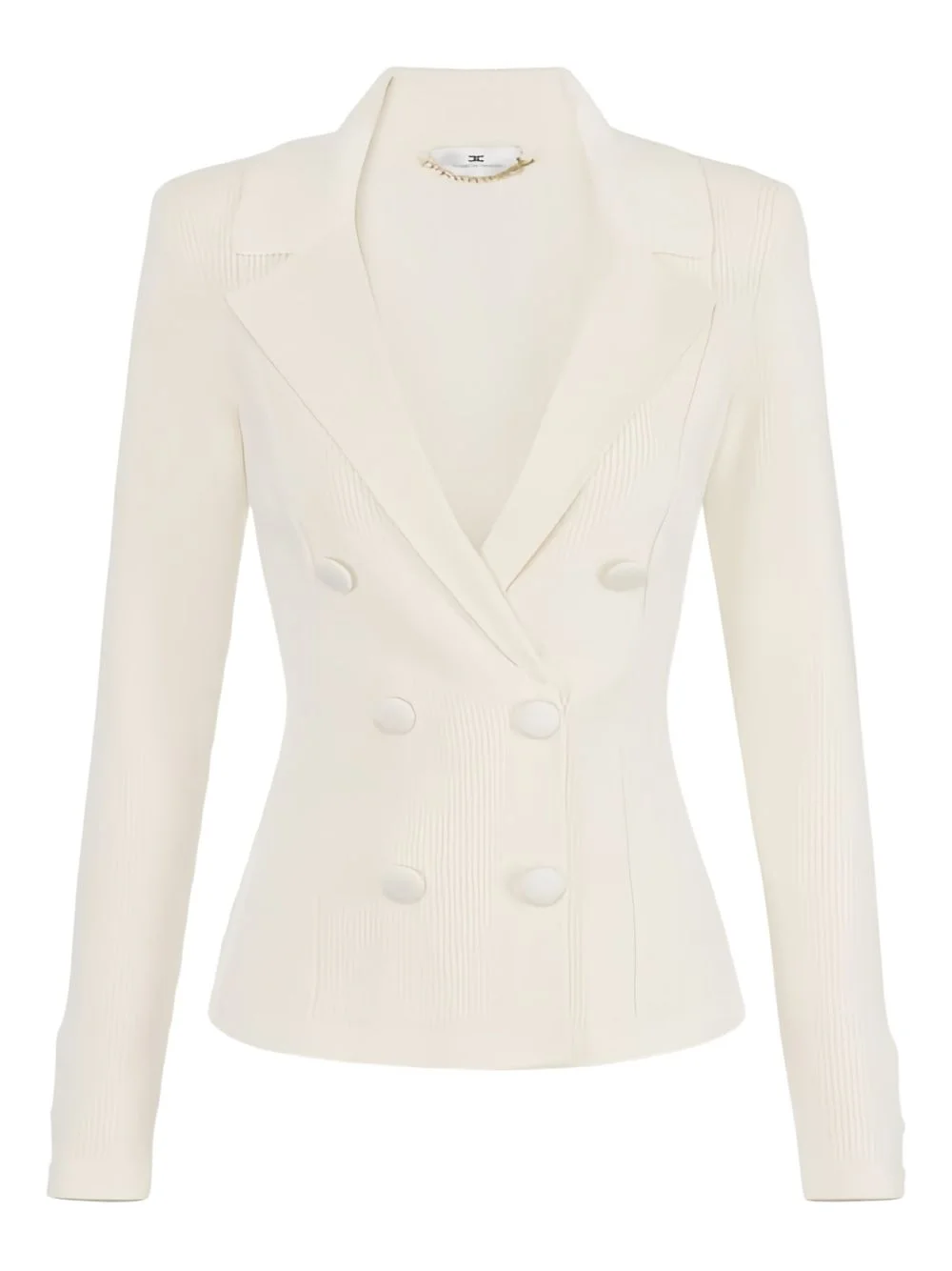 double-breasted knitted jacket Highlights - Milk - Notched lapels - Long sleeves - Snap-button fastening - Ribbed knit Imported Composition Viscose 72%, Polyester 28% Washing instructions Read Manufacturer Guidelines