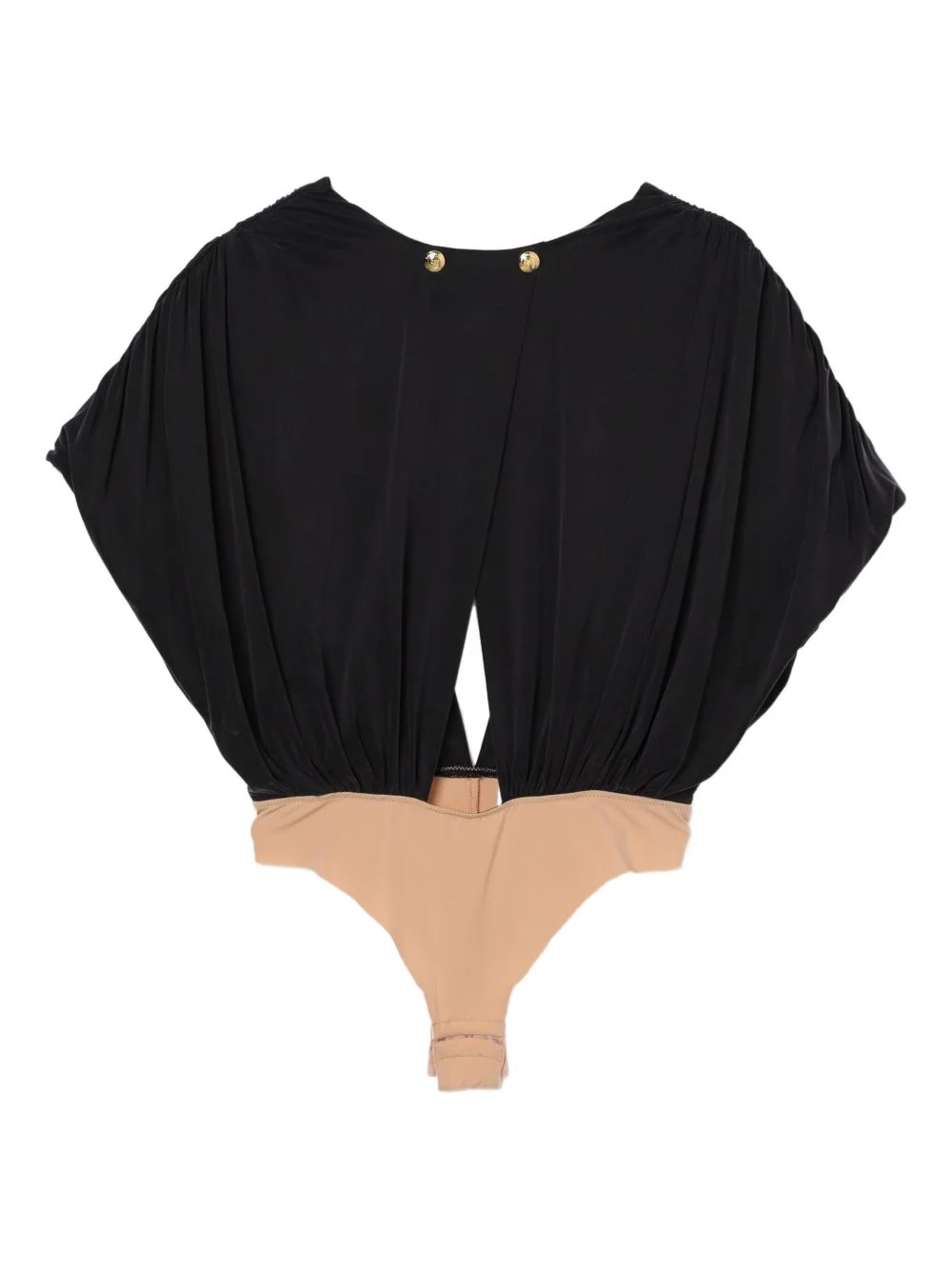 draped bodysuit Highlights - Black - Gold-tone buttons - Open back - Gathered detail - Short sleeves - Just a reminder that this piece must be tried on over your own garments. Imported Composition Polyester 100% Washing instructions Read Manufacturer Guidelines