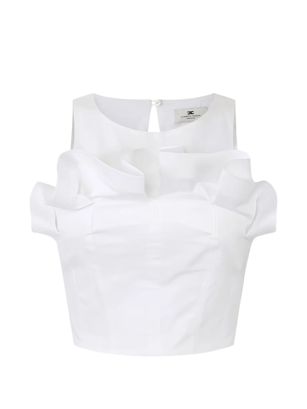 flounce crew neck top Highlights - White - Cotton - Sleeveless - Crew neck - Upside-down flounce - Rear zip fastening Made in Italy Composition Cotton 98%, Lycra 2% Washing instructions Read Manufacturer Guidelines