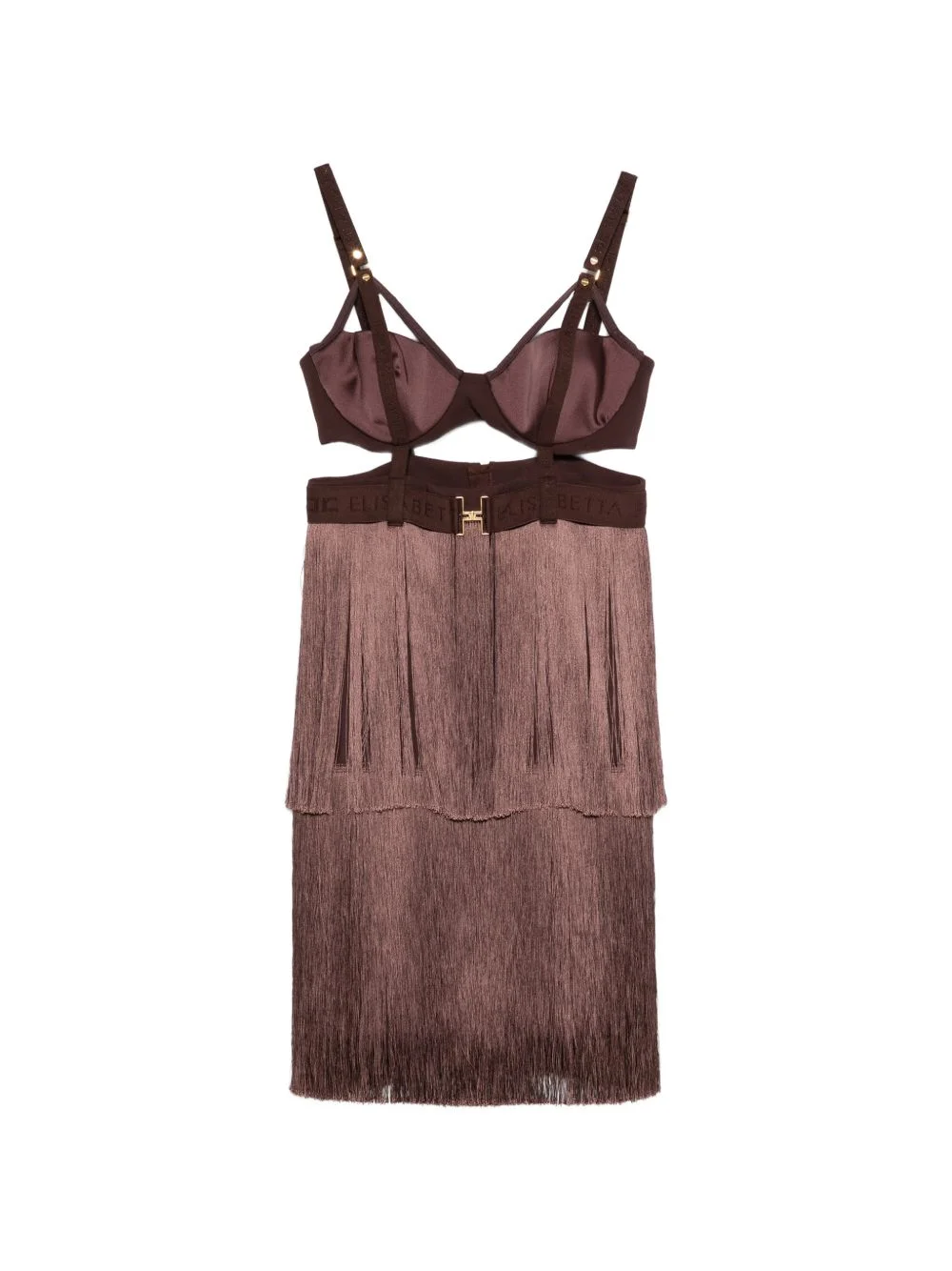 fringe bra dress Highlights - Cacao - Two-piece - Gold-tone hardware - Fringe detailing - Belt - Bra style top Made in Italy Composition Polyester 93%, Spandex/Elastane 7% Washing instructions Hand Wash