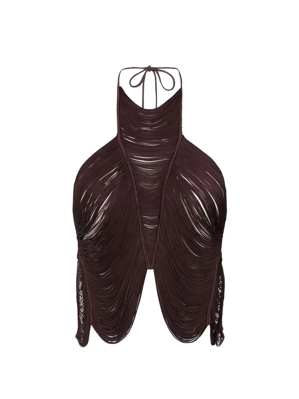 halterneck fringed top Highlights - Cocoa brown - Halterneck - Thin straps - Fringes - Slim fit - Logo detail Made in Italy Composition Polyester 100% Washing instructions Read Manufacturer Guidelines
