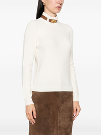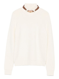 high-neck ribbed sweater Highlights - Light beige - Ribbed knit - High neck - Gold-tone hardware - Long sleeves Imported Composition Wool 50%, Acrylic 50% SIZE & FIT Model measurements Height 5 ft 10 in(1.78 m) Bust/Chest 33.46 in(85 cm) Hips 36.22 in(92 cm) Waist 23.22 in(59 cm) Washing instructions Hand Wash