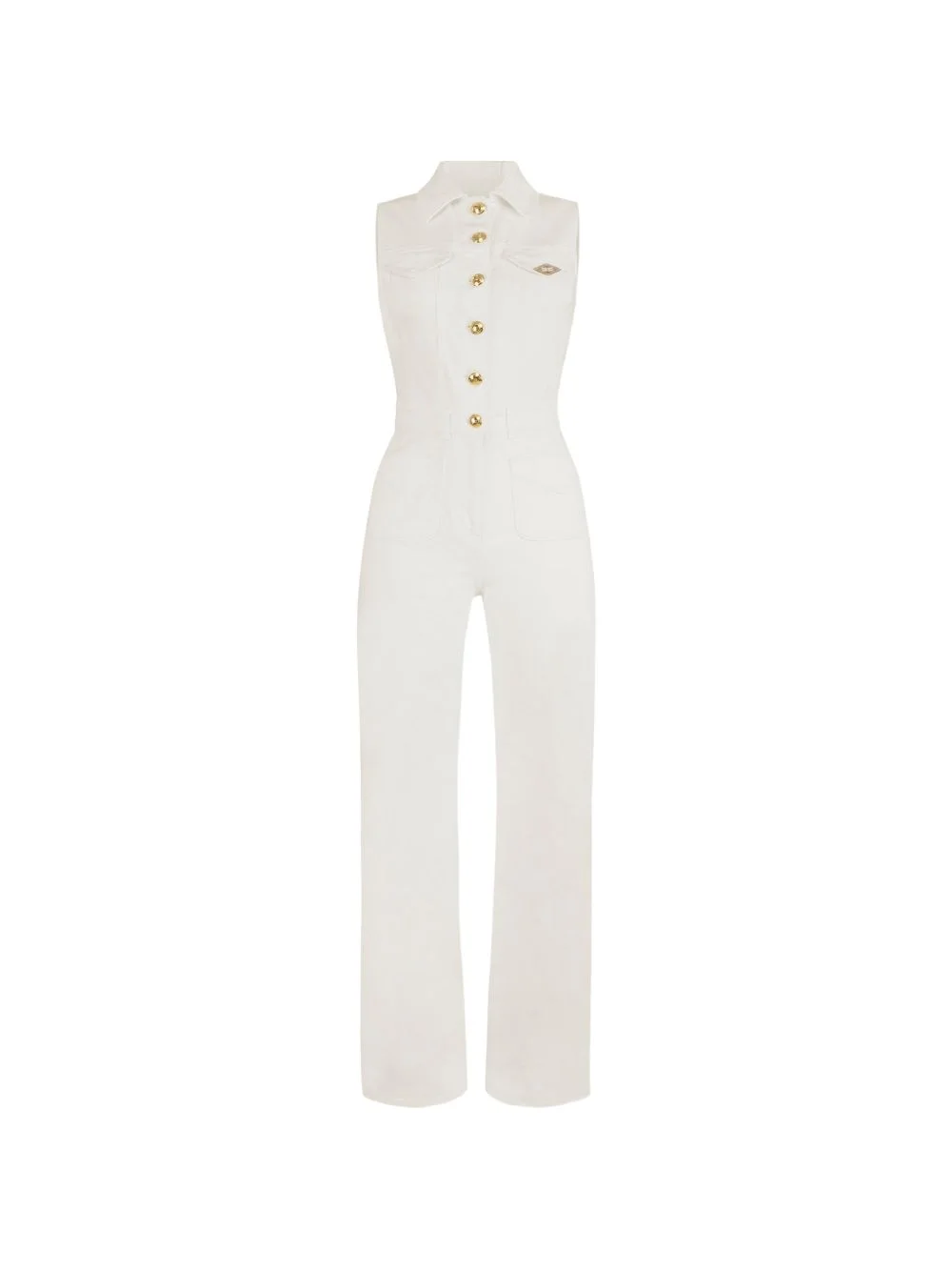 logo-detail denim jumpsuit Highlights - Ivory - Gold-tone embellishment - Sleeveless - Classic collar - Belt - Zip details Imported Composition Cotton 97%, Spandex/Elastane 3% Washing instructions Read Manufacturer Guidelines