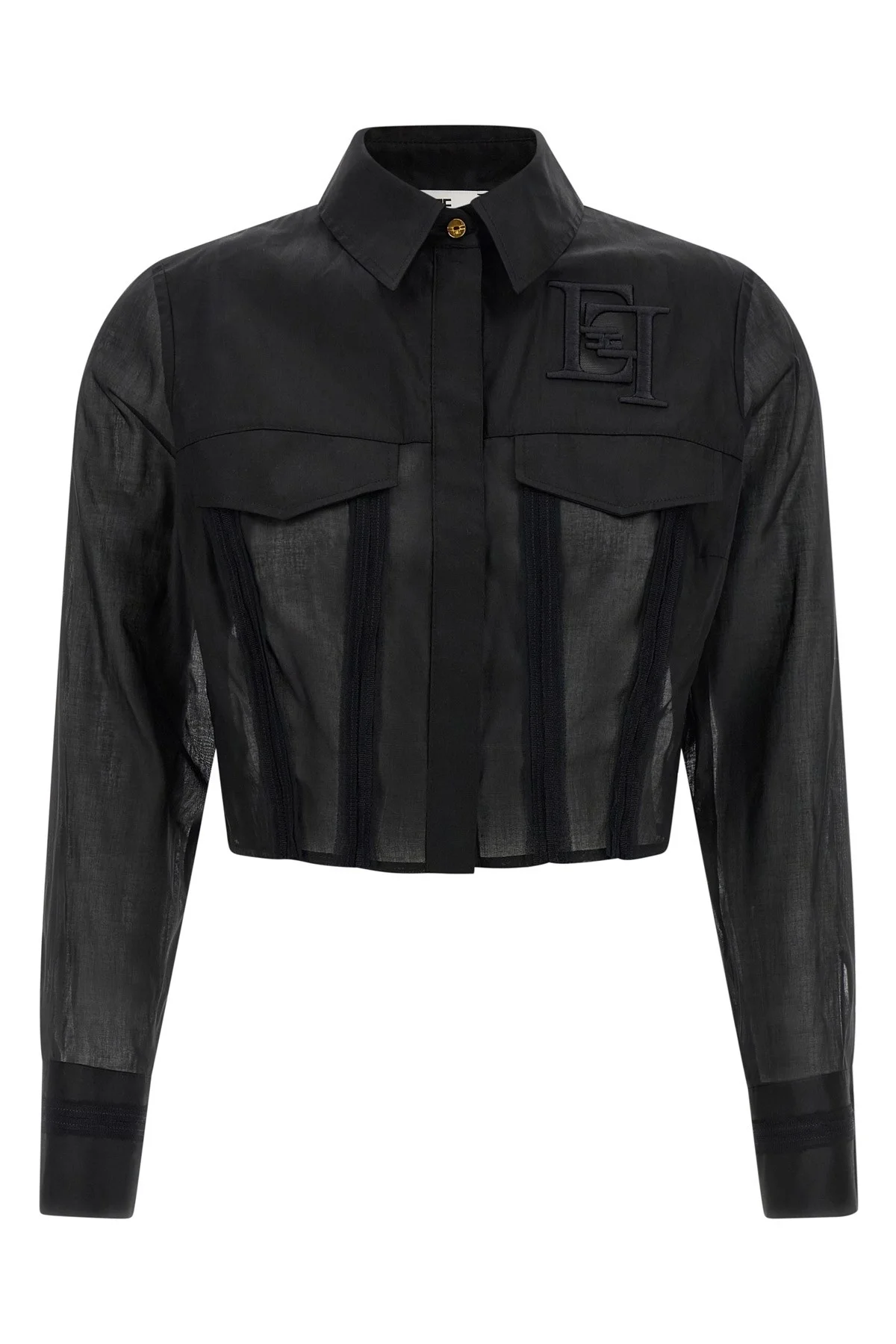 cod. CA12661E2110 Semi-transparent light cotton shirt with tonal trimmings, crop model, maxi tone-on-tone logo embroidery, concealed front button closure, long cuffed sleeves. Color: Black Size & Fit: true to size fit Composition: 100% cotton Made in: Italy