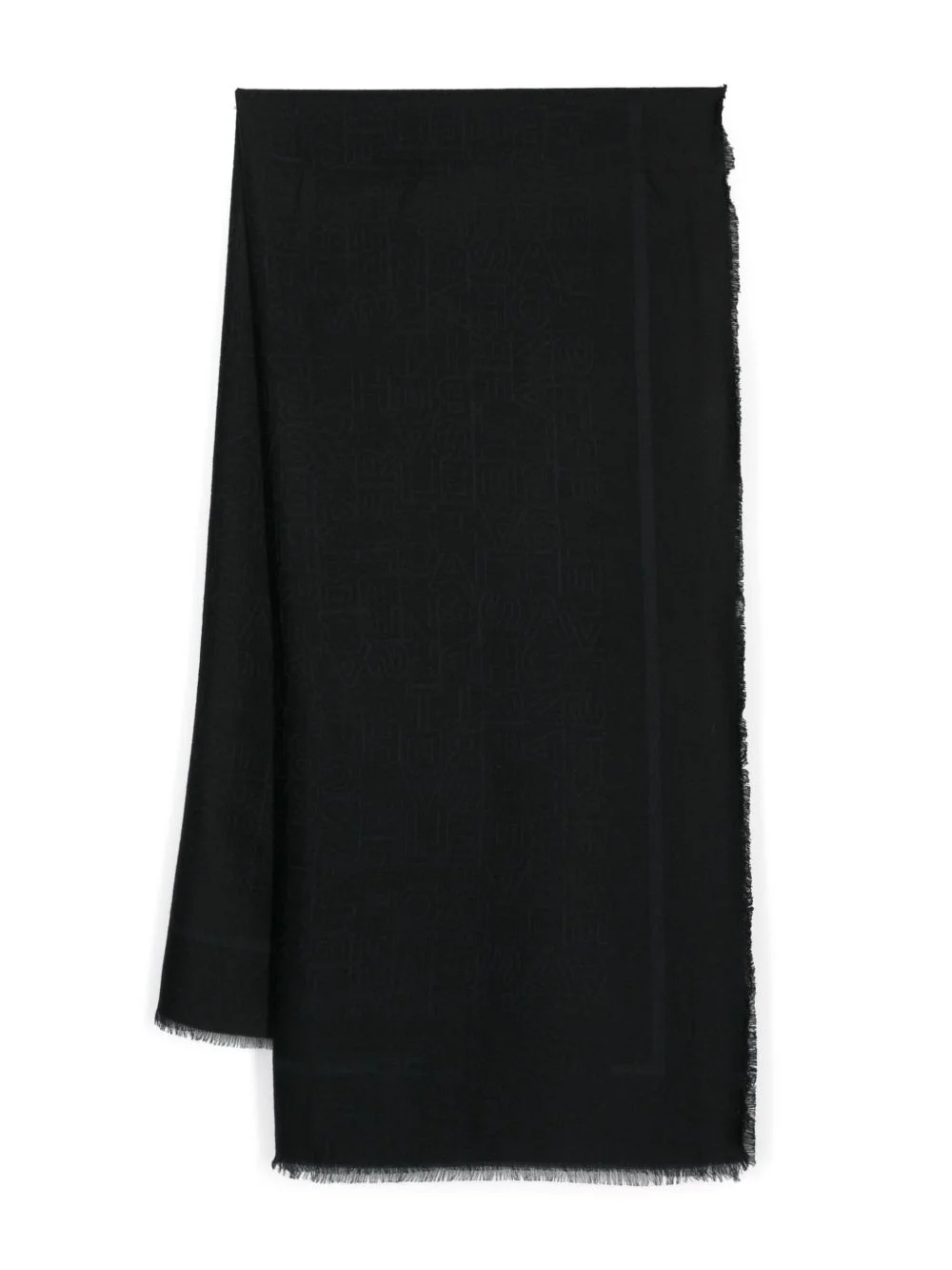 logo-jacquard frayed scarf Highlights - Black - Logo lettering patterned jacquard - Wraparound style - Square frame - Frayed edge Made in Italy Composition Viscose 60%, Modal 40% SIZE & FIT Measurement LENGTH 55.11 in(140 cm) WIDTH 55.11 in(140 cm) Washing instructions Hand Wash