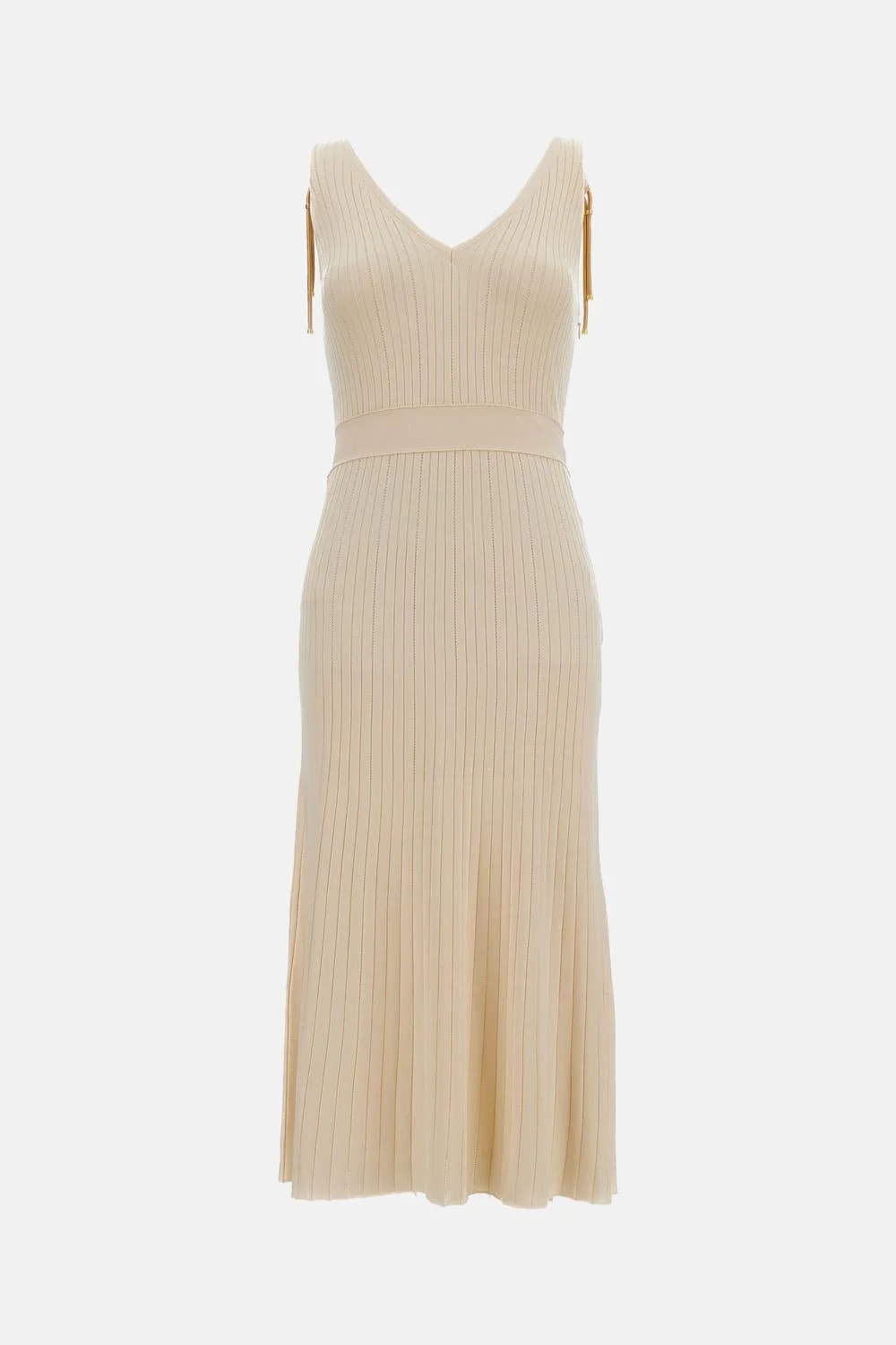 Long rib-knit maxi dress with openwork eyelet detailing Sleeveless Slim fit V-neckline Gold-tone tubular metal necklace with logo pendant on the back Side zip closure Color: white Details and Care Color: Beige Composition: 80% VI 20% PA Made in: Cina Sku: AM18S61E2193