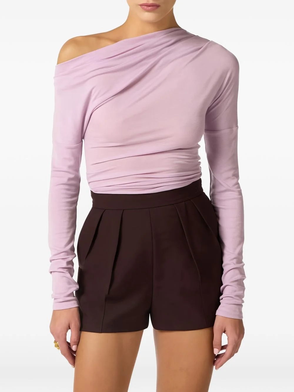 long-sleeved draped top Highlights - Lilac - Drapes at shoulders - Thread-embroidered logo at hem - Long sleeves - One shoulder Imported Composition Lyocell 76%, Wool 20%, Spandex/Elastane 4% Washing instructions Read Manufacturer Guidelines