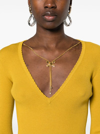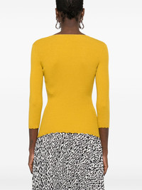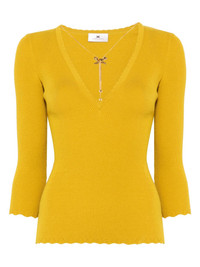 necklace-detail ribbed top Highlights - Mustard yellow - V-neck - Three-quarter length sleeves - Scallop edge Made in Italy Composition Viscose 72%, Polyester 28% SIZE & FIT Model measurements Height 5 ft 11 in(1.8 m) Bust/Chest 32.67 in(83 cm) Hips 36.22 in(92 cm) Waist 24.4 in(62 cm) FittingInformation Designed for a close fit throughout Made from a midweight non-stretch fabric, this piece offers minimal elasticity when worn Washing instructions Hand Wash