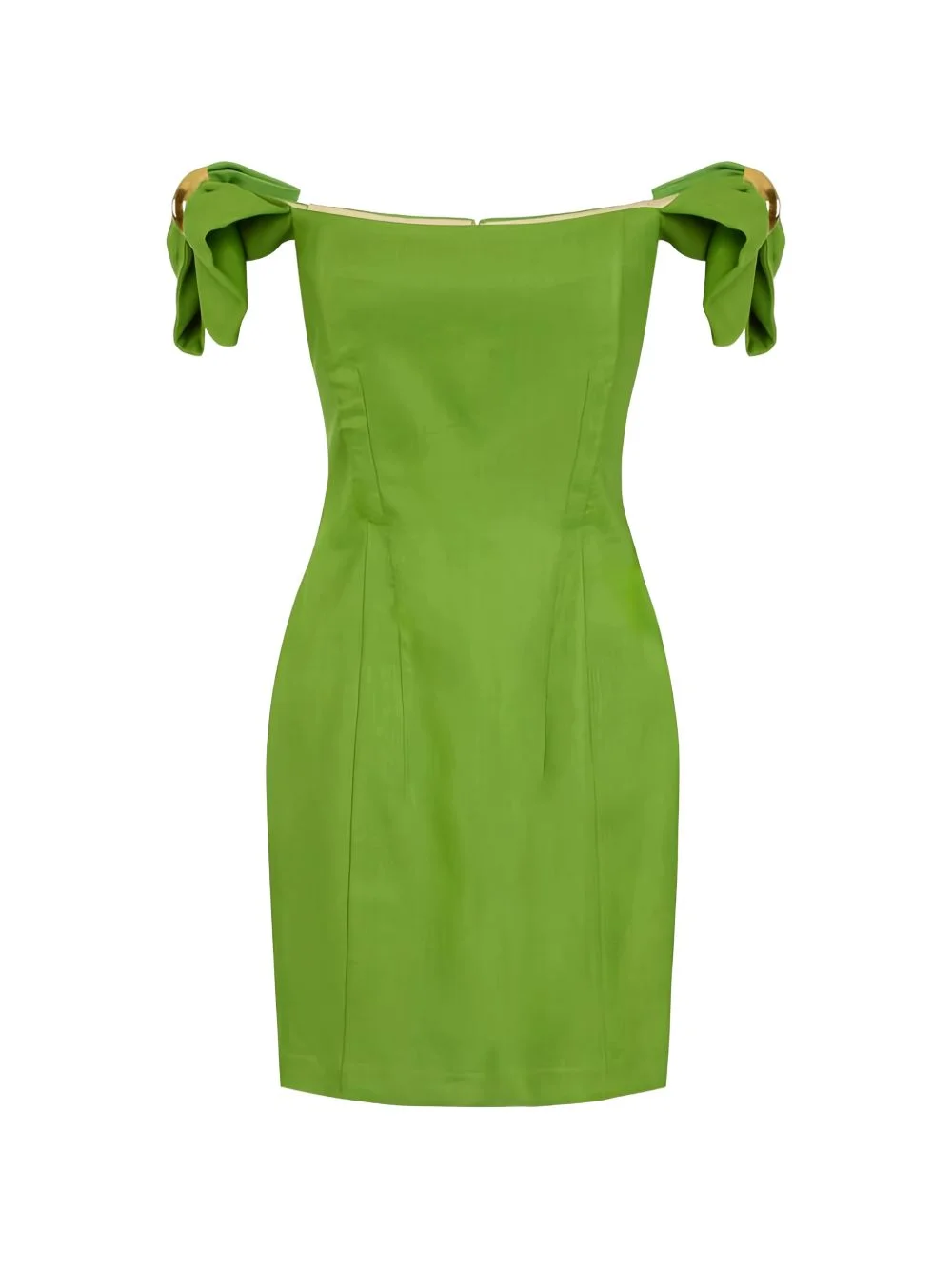 off-the-shoulder metal mini dress Highlights - Green - Linen - Amphora construction - Regular fit - Metal detail - Off-the-shoulder style Made in Italy Composition Linen/Flax 55%, Viscose 42%, Spandex/Elastane 3% Washing instructions Read Manufacturer Guidelines