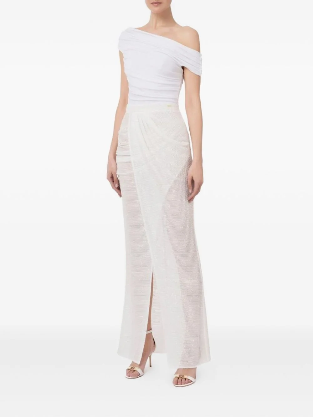 one-shoulder slit maxi dress Highlights - White - One-shoulder design - Draped detail - Front slit - Gathered detail - Semi-sheer design Imported Composition Fabric 100% Washing instructions Read Manufacturer Guidelines